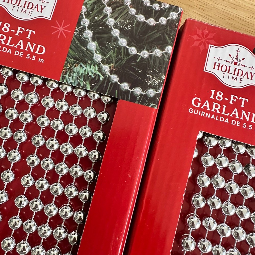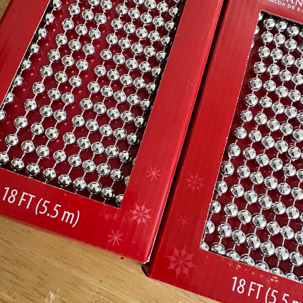 Two strands of 18 foot silver beaded garland for festive holiday decorating. Each strand features a continuous loop of uniformly sized, shimmering silver beads, offering a classic and elegant sparkle for Christmas trees, mantels, or other seasonal displays. Product: Door Decoration Form: Garland Occasion: All Occasions Material: Plastic, Metal Artificial/Fresh: Artificial Theme: Seasonal Number in Pack: Less Than 10 Unit Type: ft Keywords: Christmas garland, Beaded garland, Silver decoration, Tree ornament, Holiday decor, Winter sparkle, Party accent, Craft supply, Indoor decoration, Festive streamer, Shiny beads, Seasonal accent