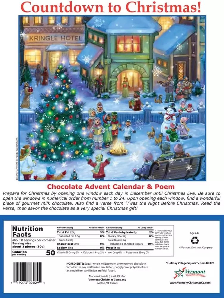 Store New Arrivals Add to Favorite View Feedback Contact Holiday Village Square Chocolate Advent Calendar (Countdown to Christmas Calendar) Description Item model number 201900016186 Format Advent Calendar Manufacturer Part Number 201900016186 Item Weight 2.6 Ounces Theme Christmas Is Discontinued By Manufacturer No Product Dimensions 13.75"L x 10"W Each window opens revealing a piece of gourmet milk chocolate. Also find a verse from "Twas the Night Before Christmas." Calendar contains 2.6 ounces of chocolate. All chocolate produced in Canada. Measures 10" x 13.75". A great way to have fun and build the anticipation for Christmas. Product Description Delicious Chocolate Advent Calendars from Vermont Christmas Company Countdown to Christmas Rekindle an old family tradition by counting down to Christmas with a chocolate Advent calendar! Prepare for Christmas by opening a window each day beginning Decemeber 1. Can you find all 24 windows? Unique Artwork Contemporary artists create all of the fun artwork featured on our chocolate Advent calendars. Each Advent calendar contains 2.6 ounces of yummy milk chocolate and measures 10"x13 3/4". Delicious Milk Chocolate Upon opening each window, find a wonderful piece of gourmet milk chocolate crafted in a fun holiday shape. Also find a verse from Twas the Night Before Christmas. ABOUT US We offer the best prices around on high quality products. Our E-store includes media such as books, movies, music and games while offering electronics, toys, sporting apparel, clothing, tools, general home, garden items and more. SHIPPING We are always working hard to ensure your package arrives as soon as possible. Please understand that some factors like weather, high postal traffic, and the performance of shipping companies are outside of our control. We offer free shipping to the lower 48 states and ship within 2 business days of payment, usually sooner. We do not accept P.O. Boxes. Please provide a physical address. For shipping outside of the continental USA, we only use eBay's Global Shipping Program.The item is shipped to KY and then sent to the rest of the world. International customers are responsible for all duties and taxes. Continue to check out in order to calculate costs for shipping the item to your country. Messages regarding eBay's Global Shipping Program MUST be directed at eBay EXCLUSIVELY. RETURNS We offer a 30-Day Return Policy on items which you are not completely satisfied with. You have the option for a full-refund or an exchange of the item. No returns are available on items shipped outside of the USA. PAYMENT We accept PayPal. CONTACT US This page content is yet to come Please ad us to your favorite seller and visit again later Thank You CUSTOMER SATISFACTION We try our very best to make sure every customer is completely satisfied. If there's a problem, message us! We're happy to help. WE ACCEPT Copyright © 2021 AutoDS. | All Rights Reserved