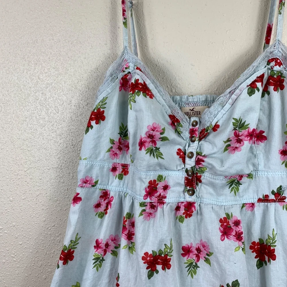 Hollister Blue FloralY2K Style Babydoll Mini Dress - Size Large Great preowned condition! Adjustable straps Smocked in the back Lined P2P: 15" Length: 27" Measurements are lying flat, and estimates only. 1P25 18-5915 6 oz
