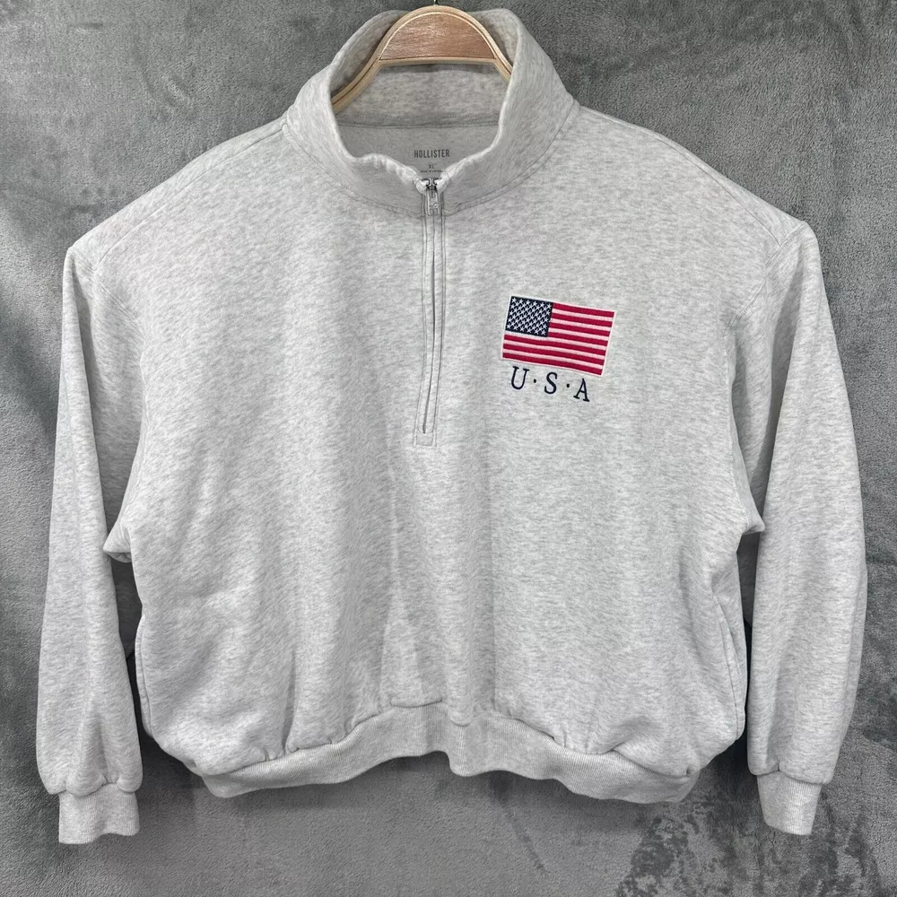 Hollister California Cropped Sweater Women's XL Quarter Zip America USA Flag Great condition. No stains, rips, or tears. Material: See Pictures Measurements: See Pictures *We have many similar items in stock. Please check out our store for more. ***Color variation might vary slightly due to camera and lighting*** If you have questions, please message me. I answer INSTANTLY! Fast shipping available. I do most of the shipping within 1 business day! And ship via USPS with a tracking number emailed to you. Thanks for Shopping!