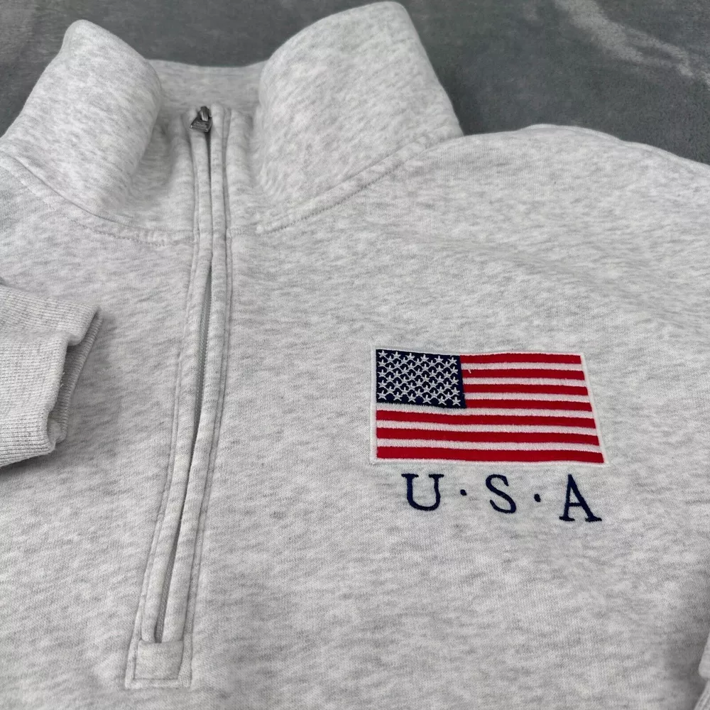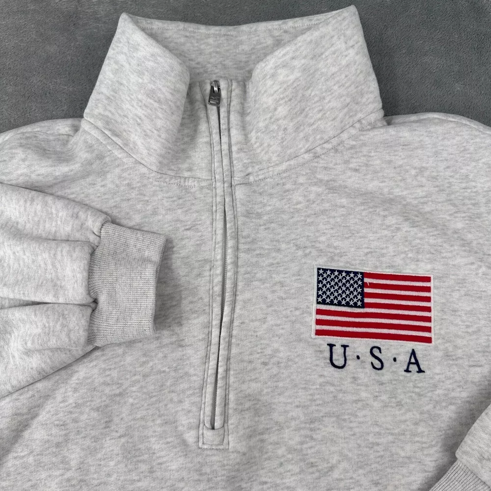 Size: XL Seller Notes: “Great condition. No stains, rips, or tears.” Color: Gray Neckline: Mock Neck Sleeve Length: Long Sleeve Brand: Hollister Fabric Type: Fleece Type: Sweatshirt Occasion: Casual Pattern: Solid Size Type: Regular Closure: Zip Theme: Flag Features: 1/4 Zip Accents: Zipper, Logo Style: Pullover Department: Women