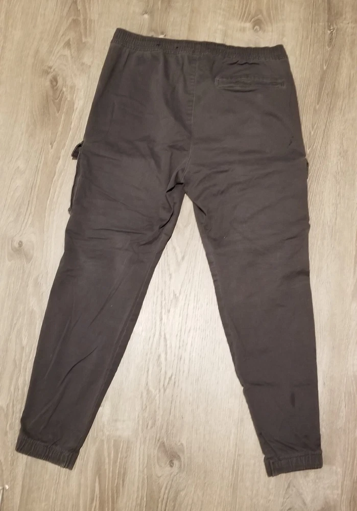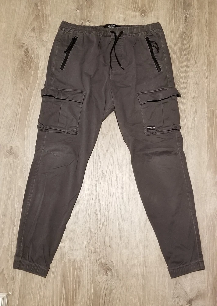 Elevate your travel or casual look with these Hollister Cargo Skinny Jogger Pants. These pants feature a drawstring closure and elastic waist for a comfortable fit. The cargo pockets provide ample storage space, making them perfect for on-the-go use. Crafted from a soft cotton blend knit fabric, these pants are machine washable and easy to care for. They come in a stylish gray color with a solid pattern and a flat front design. These pants have a high rise of greater than 12 inches and a skinny leg style with a 28-inch inseam. The Hollister logo accents and zipper details add a touch of preppy city style to the overall design.
