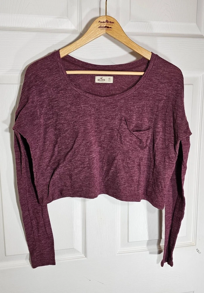 Beautiful Hollister crop top long sleeve. Excellent pre-owned condition, no signs of wear, stains, snags, etc. The pocket is a little saggy. very soft and comfortable material. I love the heathered maroon and oversized fit! Thank you for your interest, I am available anytime to answer questions about this item! Measurements Are: (L) 16.5in. Shoulder to hem. (W) 22.5in. Pit to pit. (Sleeves) 20in.