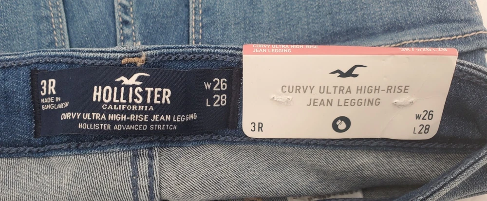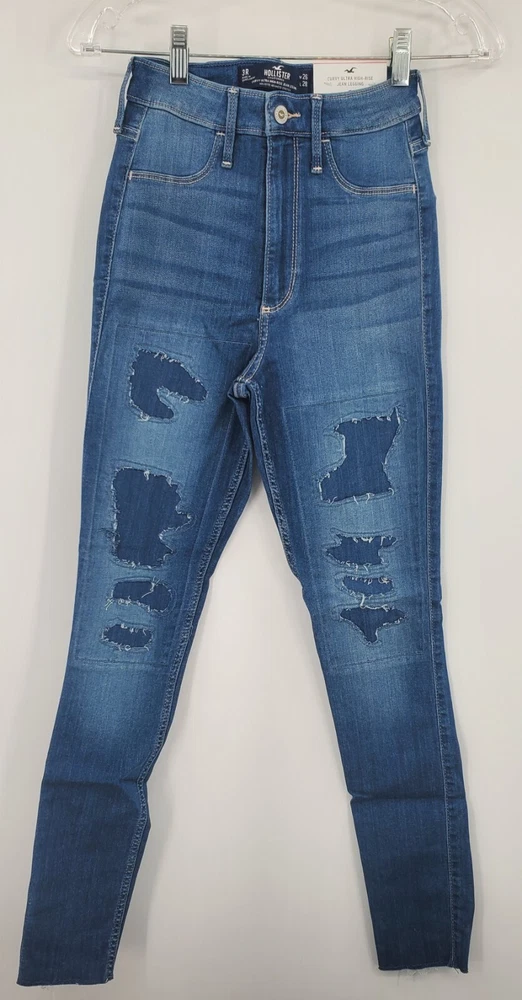 Hollister Curvy Ultra High Rise Jeans Legging Jegging Stretch Women Size 3R New. They are blue with distressed patch areas on the front of the legs, the bottom of the pant legs have a raw hemline and distress on the back. They're made of 59% cotton, 21% viscose, 12% modal, 6% polyester and 2% elastane. Please check measurements to ensure fit. The waist measurement is 24 inches, the rise is 11 inches and the inseam is 28 inches.