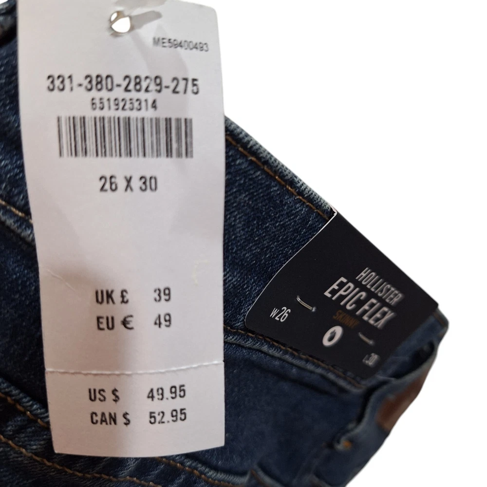 Hollister Epic Flex Medium Wash Skinny Jeans Men's Size 26" x 30" NEW Brand new with tags from a smoke-free home. Men's Size 26" x 30". Approximate flat lay measurements: Waist: 15.75", Inseam: 30", Rise: 10", Leg opening: 6.5".