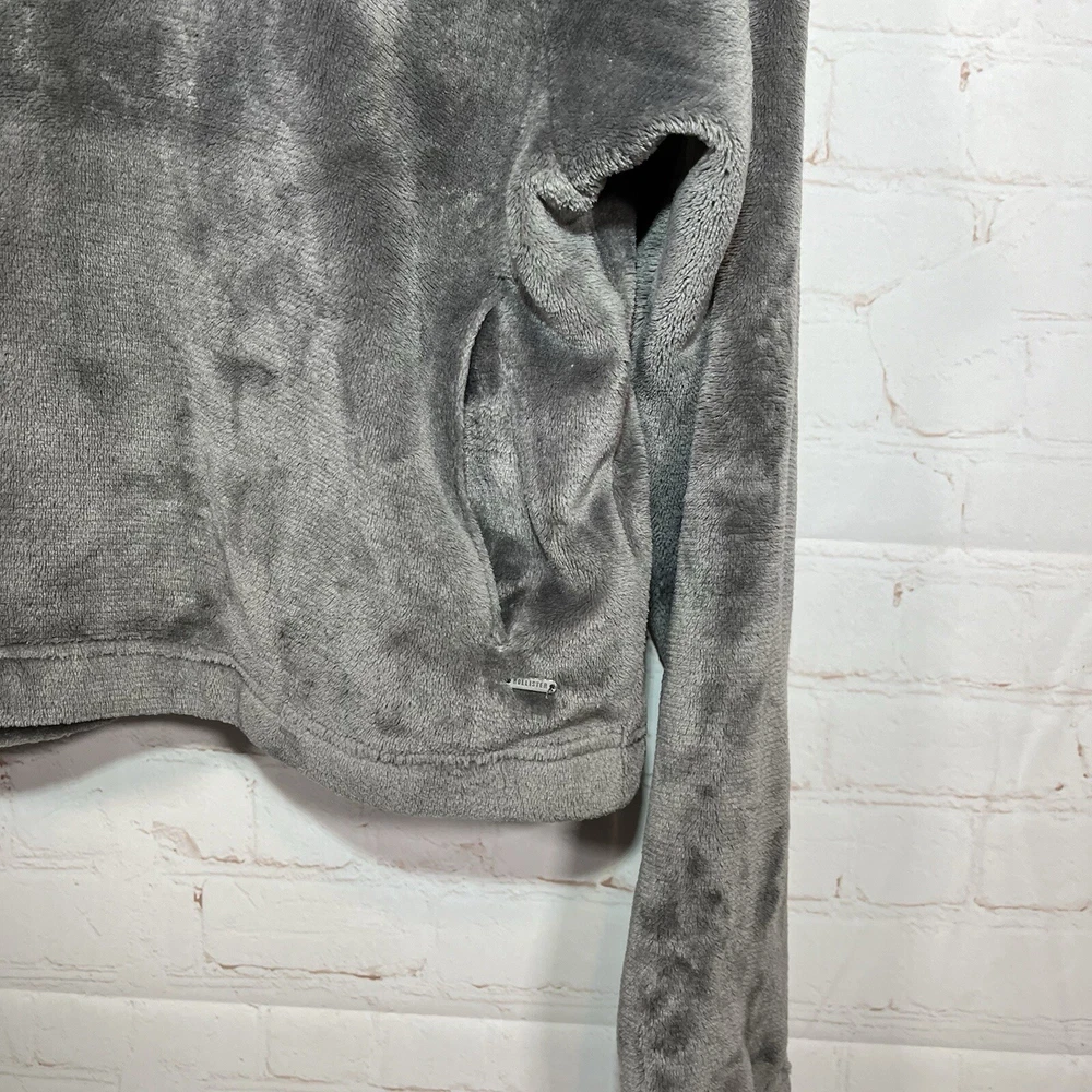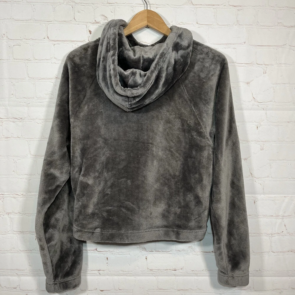 Hollister Hoodie Womens Size Small Gray Faux Fur Cropped Sweatshirt Sweater See measurements for accurate fit Pit to pit 20 inches Shoulder to hem 21 inches Measurements are done flat lay