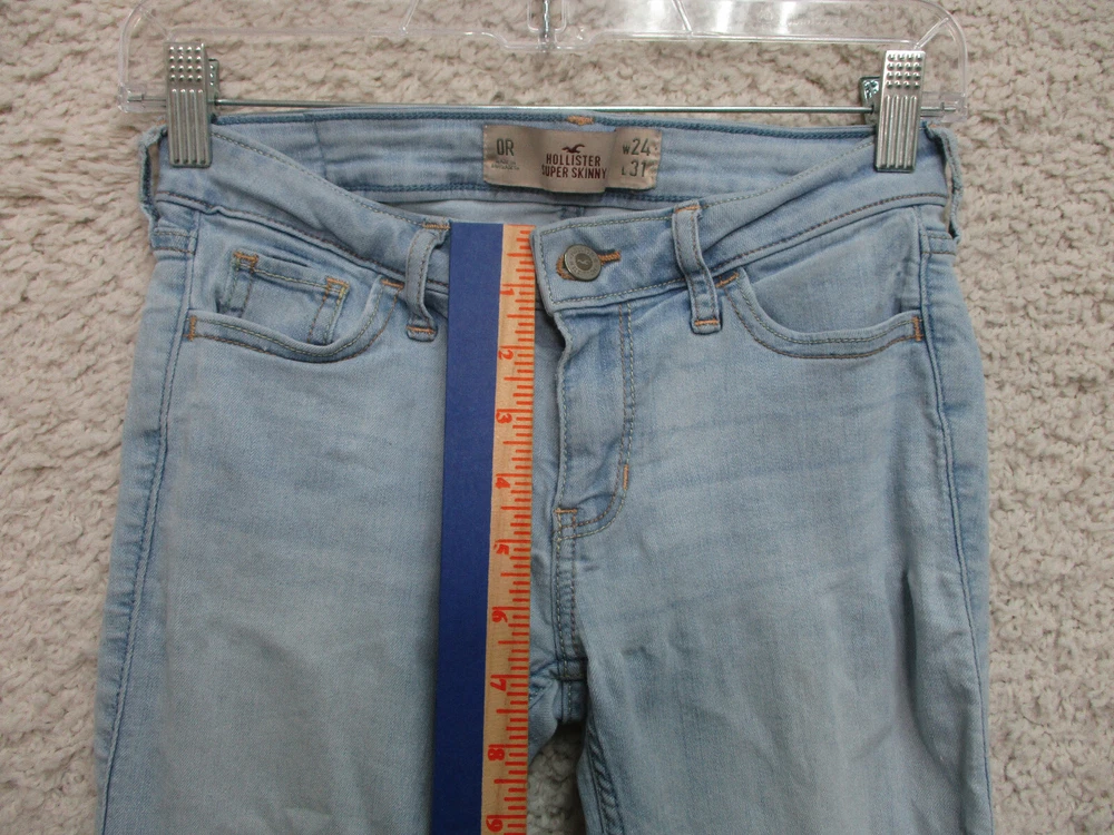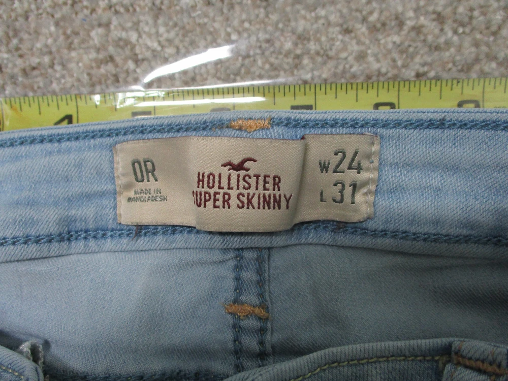 Size Type: Regular Waist Size: 24 in Accents: Button, Logo Garment Care: Machine Washable Material: Cotton, Cotton Blend Fit: Regular Color: Blue Pocket Type: 5-Pocket Design Country/Region of Manufacture: China Size: 0 Pattern: Solid Closure: Zip Theme: American, Logo, Modern Brand: Hollister UPC: Does Not Apply Department: Women gtin13: Does Not Apply Suspender Buttons/Belt Loops: Belt Loops Style: Skinny Fabric Type: Denim Type: Jeans Season: Fall, Spring, Summer, Winter Seller Notes: “Very Good Used Condition. Please, See Pictures for Full Condition and Measurements.” Rise: Mid (8.5-10.5 in) Inseam: 31 in Features: Comfort, Easy Care, Pockets, Stretch