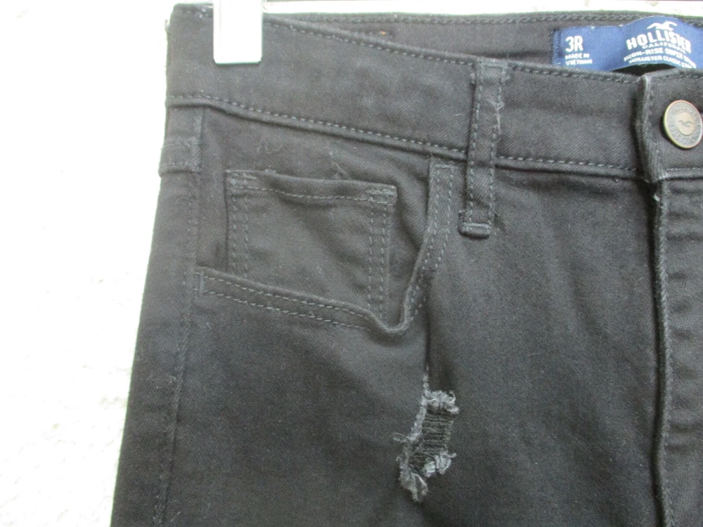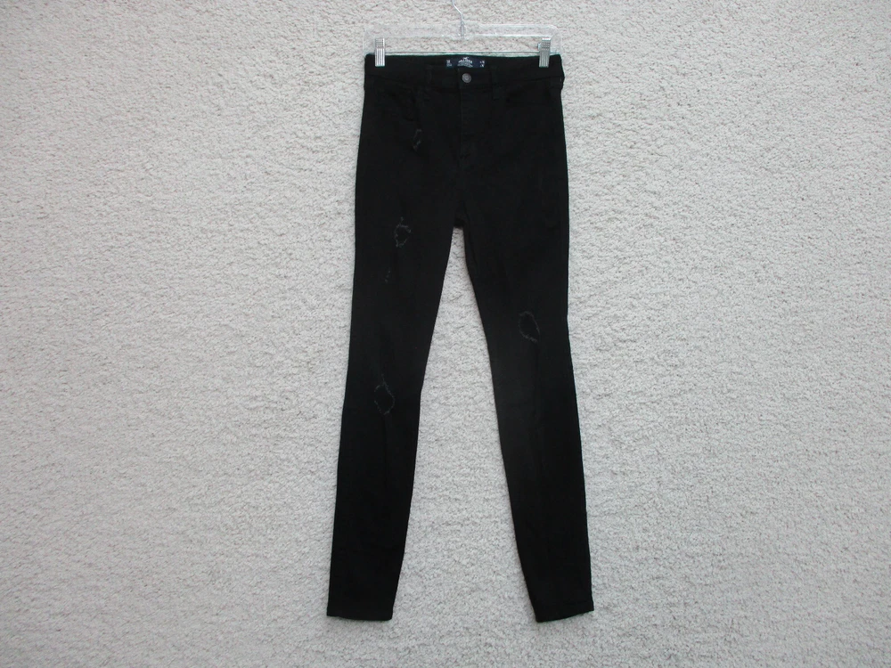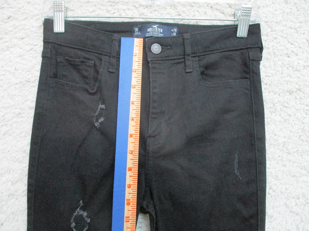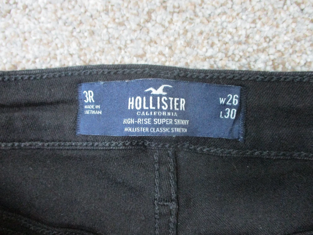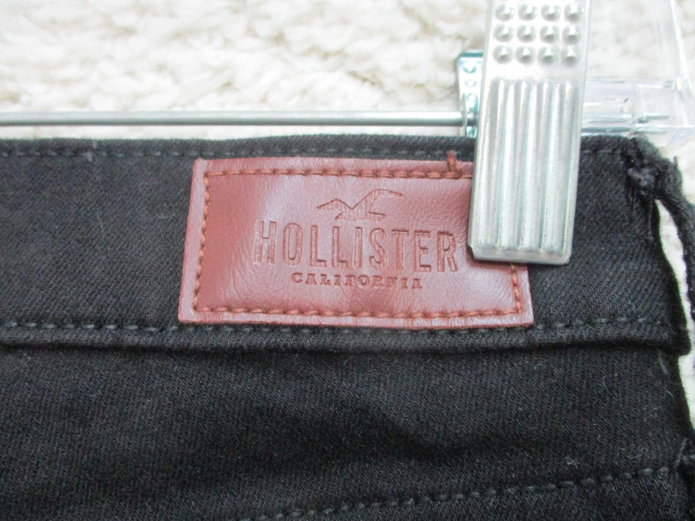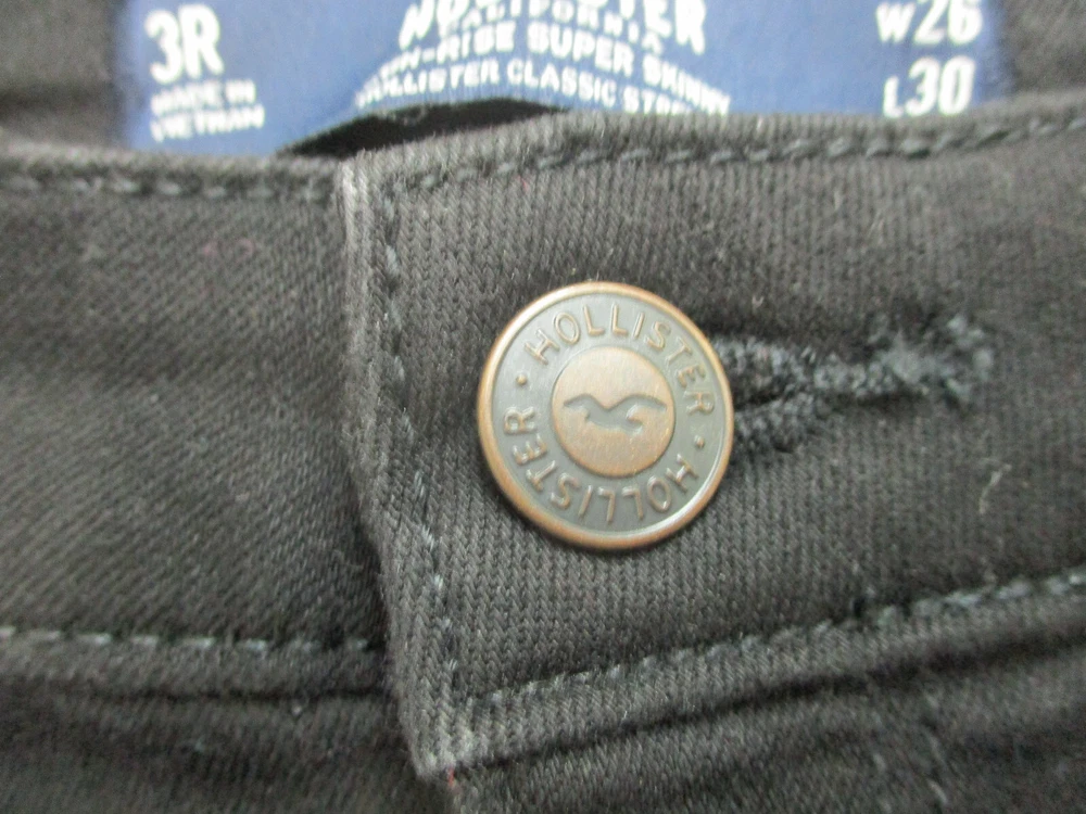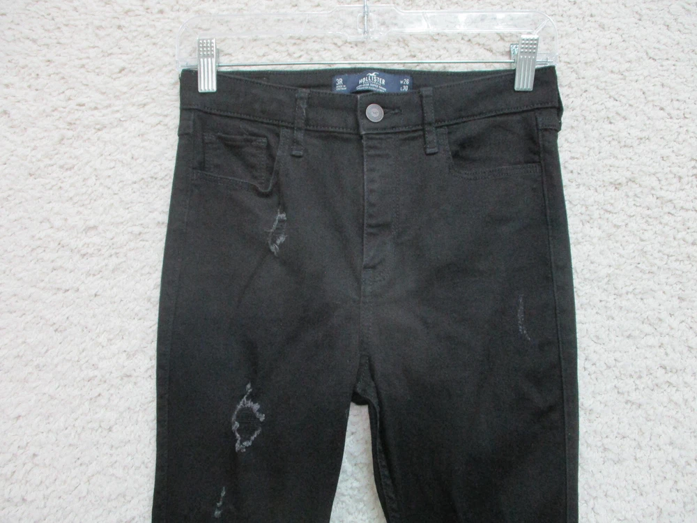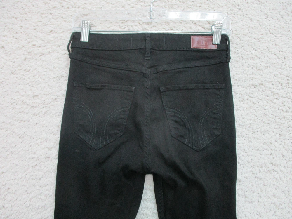 Country/Region of Manufacture: China Waist Size: 26 in Theme: American, Logo, Modern Fit: Regular Material: Cotton, Spandex Type: Jeans gtin13: Does Not Apply Pocket Type: 5-Pocket Design Size: 3 Rise: High (Greater than 10.5 in) Color: Black Style: Skinny Pattern: Solid Features: Comfort, Easy Care, Pockets, Stretch Accents: Button, Logo Size Type: Juniors Garment Care: Machine Washable Brand: Hollister Suspender Buttons/Belt Loops: Belt Loops Fabric Type: Denim Distressed: Yes Season: Fall, Spring, Summer, Winter Inseam: 30 in Department: Women Closure: Zip Seller Notes: “Very Good Used Condition. Please, See Pictures for Full Condition and Measurements.” UPC: Does Not Apply Fabric Wash: Dark