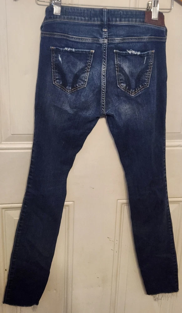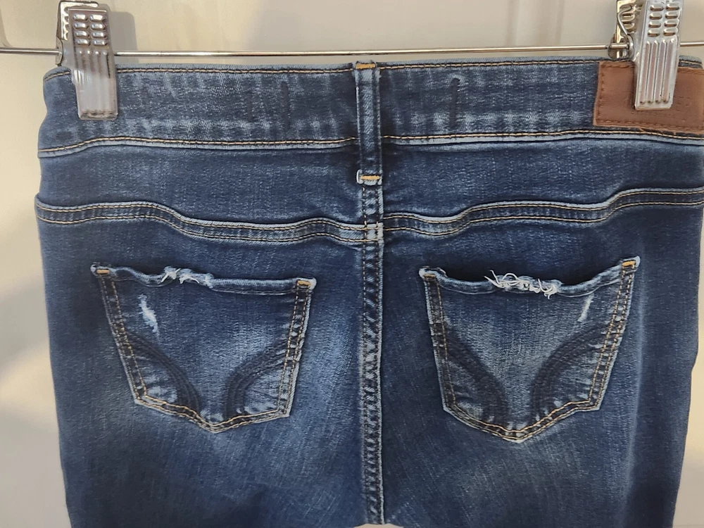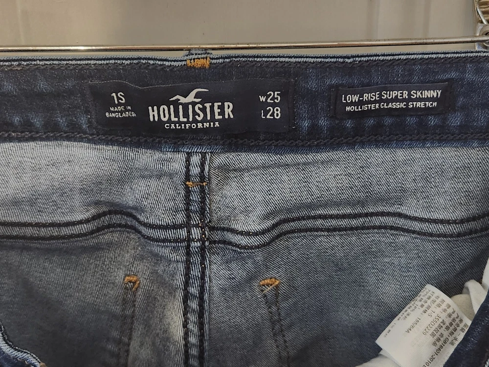 Elevate your denim game with these Hollister Jeans Women's 1S W 25 L 28 Skinny jeans. Crafted from medium wash denim, these jeans feature a solid pattern and a low rise fit. The zipper closure and button accents add a touch of style to these jeans, along with the Hollister logo. The distressed and stretchy fabric wash provides comfort and a unique look, while the pockets allow for convenient storage. These jeans are perfect for any casual occasion, and the slim fit and skinny style provide a flattering look. Add these Hollister Jeans to your wardrobe today!