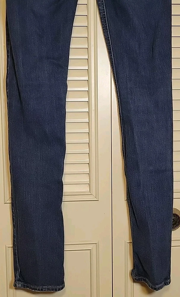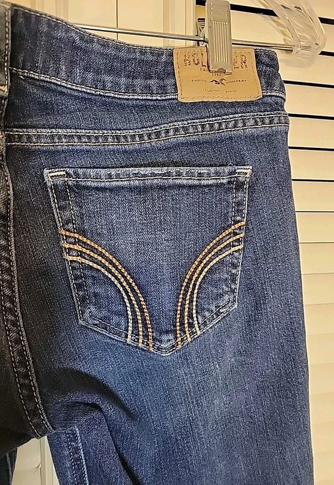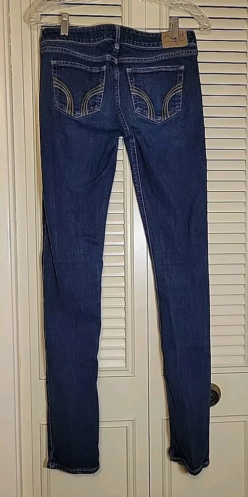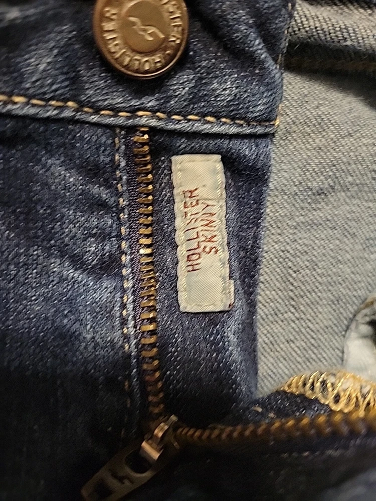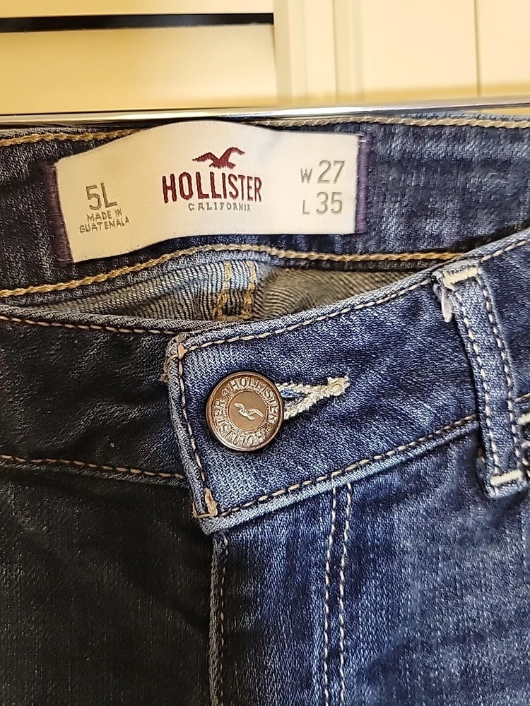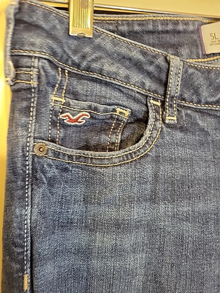 These Hollister jeans are in a size 5L with a slim fit, low rise, and skinny style. They are made of stretchy blue denim fabric with a 5-pocket design and a button and zip closure. The jeans feature a logo accent, have a waist size of 28 inches, and an inseam of 32½ inches. Designed for juniors, they offer comfort and are machine washable.