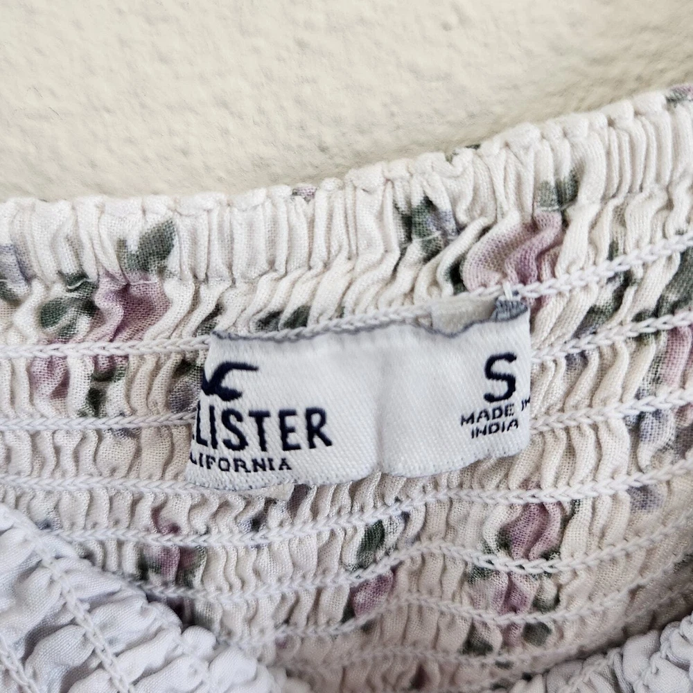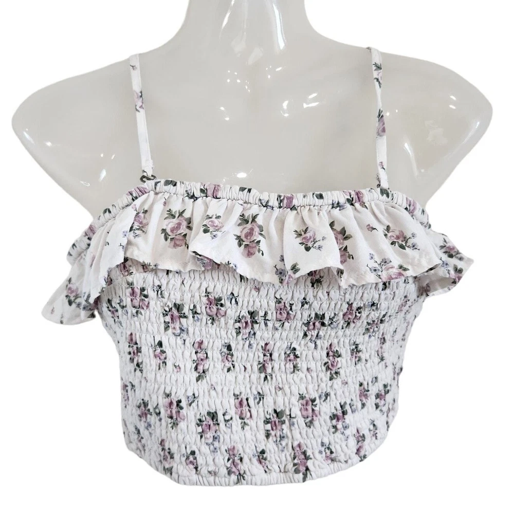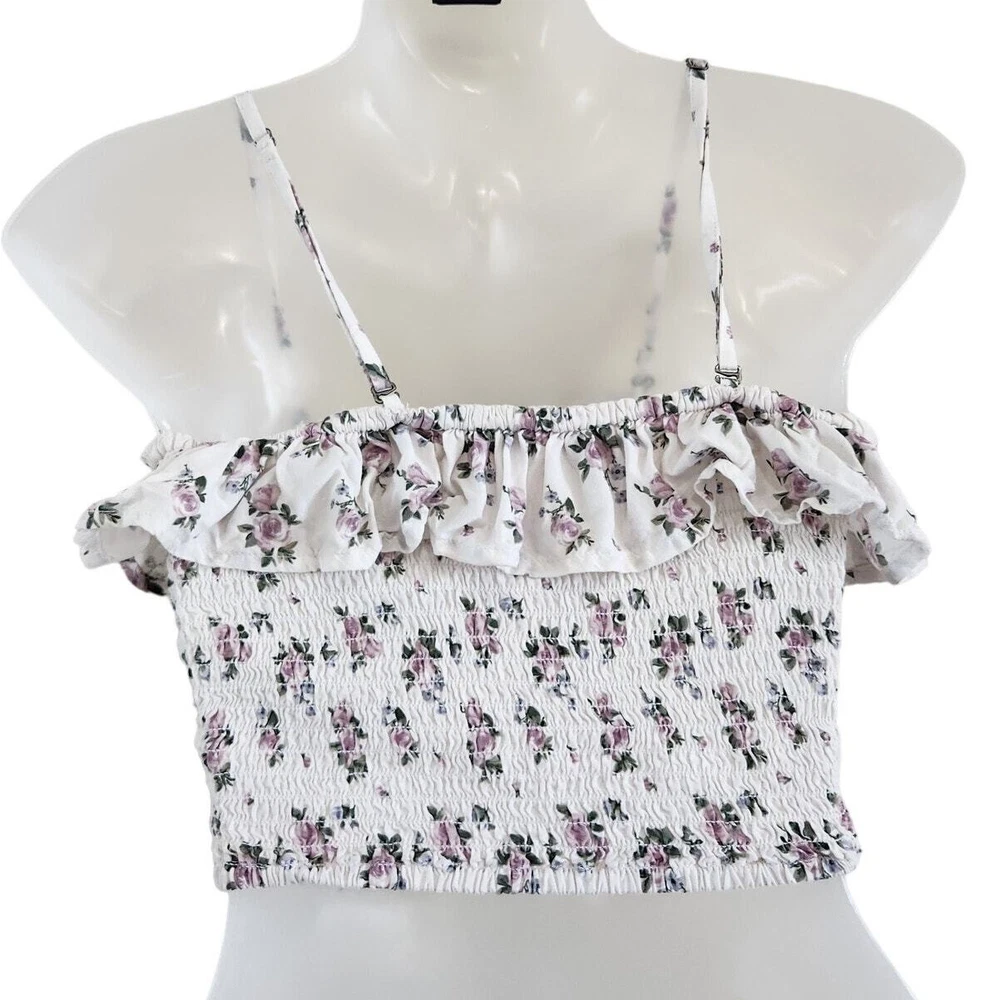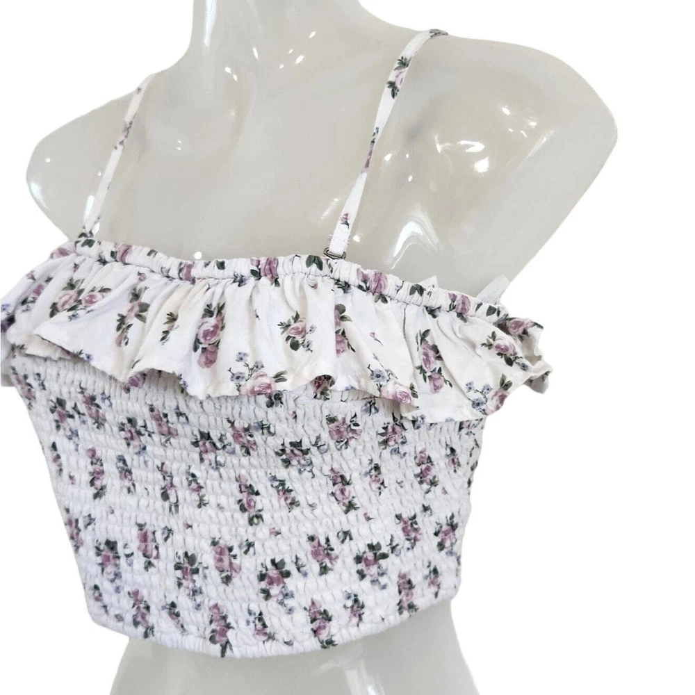 Hollister Ruffle Smocked Cropped Top Bandeau Convertible Floral White Size Small Good pre-owned condition. Features: Outer fabric material: Viscose Floral pattern Bust darts Adjustable straps Fitted bodice Square neckline Cropped length Smocked Ruffle accents along the front up to back Floral allover Tags: athleisure tennis prep gorpcore clean girl old money quiet luxury whimsigoth fairycore y2k 90's glam feminine coquette minimal festival western skater model off duty beachy beach coastal vacation travel sportswear sporty retro girly cute going out top flirty frilly ruffle lace
