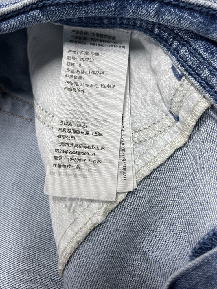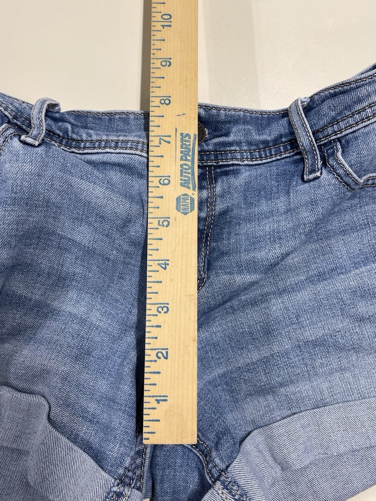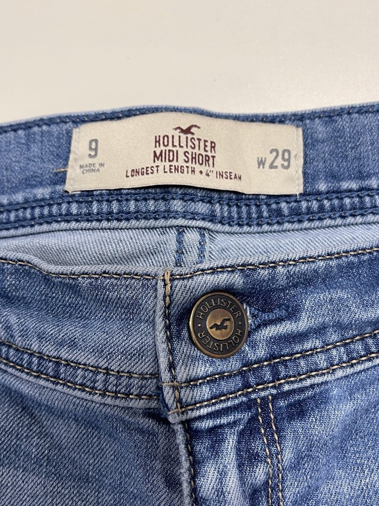 The product is a pair of Hollister midi jean shorts in size 9, designed for women who are juniors. These jeans are a stylish option for the summer season, featuring a longer 4" inseam and a cut-off style. Made from denim fabric, they are in a classic blue color, perfect for casual and trendy outfits. Perfect for keeping cool and stylish during the warmer months.