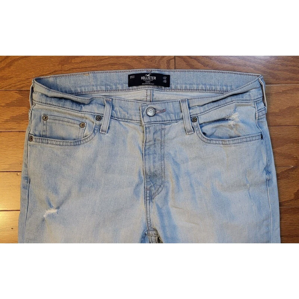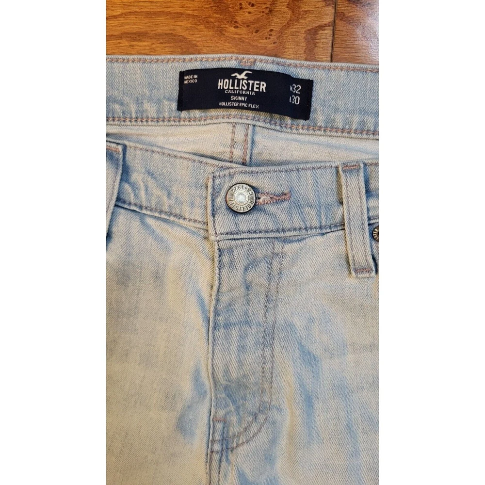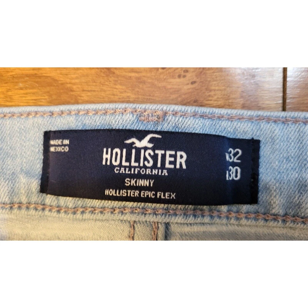 Elevate your everyday style with Hollister Skinny Epic Flex Men's Jeans in a versatile light blue wash. Designed to offer both fashion and function, these jeans feature a slimming silhouette that complements the figure, alongside a comfortable stretch denim that ensures ease of movement throughout your day. The jeans include classic accents such as a logo patch and button closure, combined with a practical 5-pocket design for everyday essentials. With a mid-rise waist and a regular fit, these size 32 jeans provide a tailored look that's perfect for any casual occasion, whether it's a day out with friends or a laid-back evening event. Waist measures 32 in Inseam measures 30 in Mid-Rise measures 10 in Excellent pre-owned condition jeans. Add these comfy jeans to your wardrobe today!