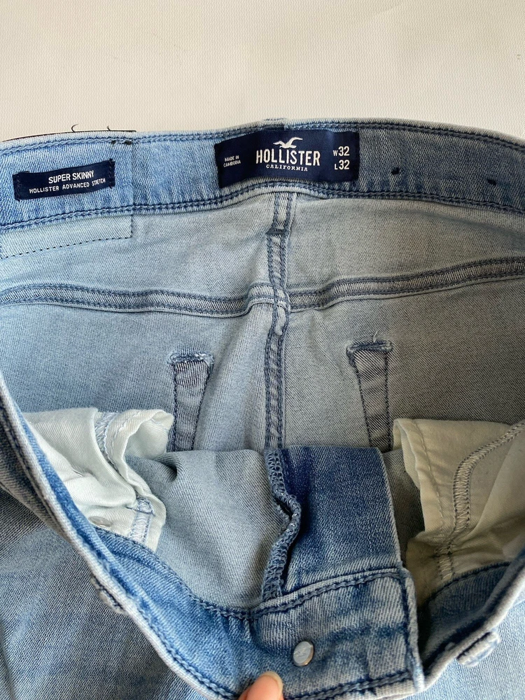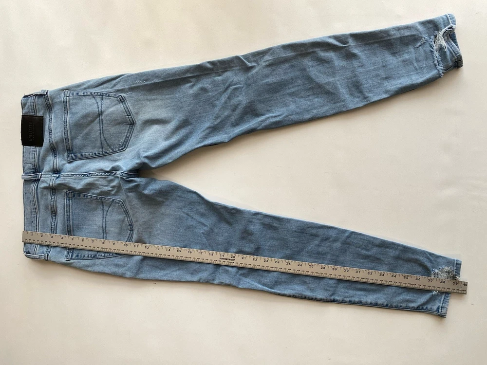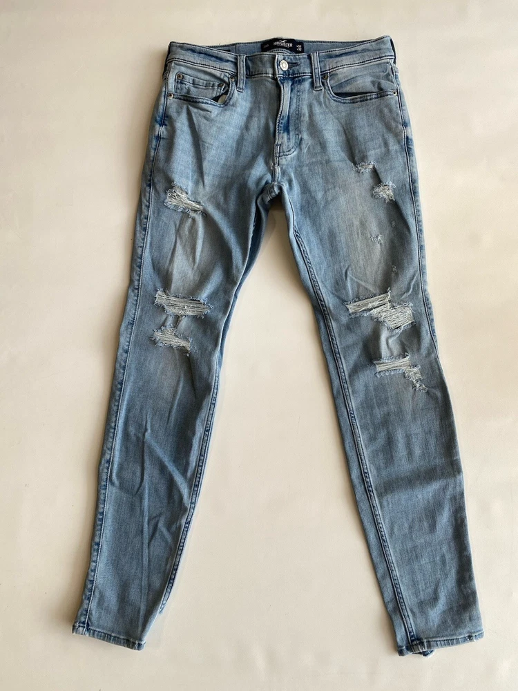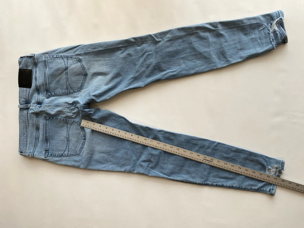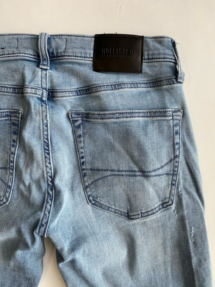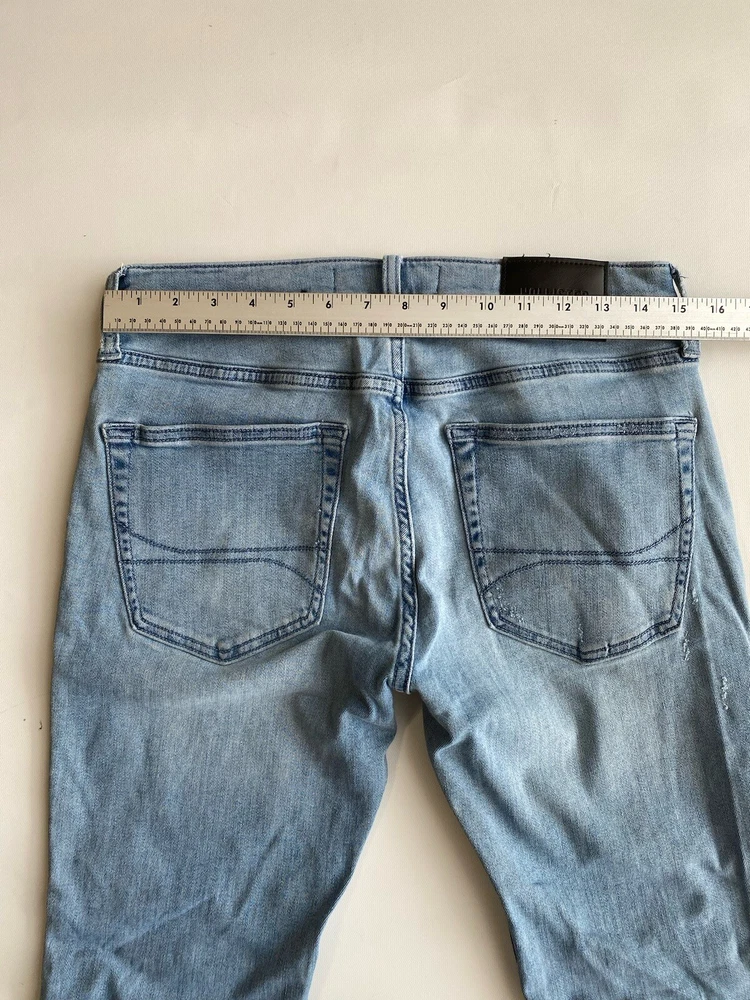 Upgrade your wardrobe with these Hollister Super Skinny Jeans. These cotton blend denim pants feature a 5-pocket design with a zipper and button closure. The distressed denim wash and logo accents add a touch of style to these slim-fit jeans. The stretch fabric ensures they are comfortable to wear and easy to care for. Suitable for all seasons, these jeans are perfect for a casual look. The waist size and inseam can be seen in the pictures. These high-quality jeans are an excellent addition to any men's clothing collection. Condition of the item is Pre-Owned in great shape! Shipped asap by USPS ground advantage Mail.