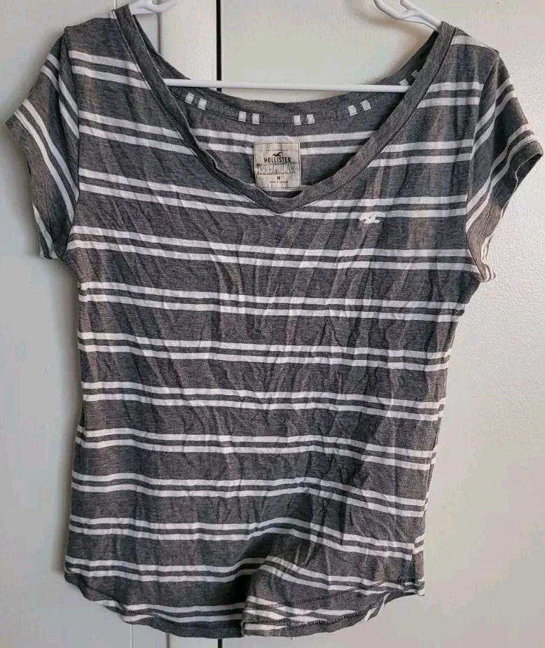 This Hollister T-shirt is a stylish and comfortable addition to any wardrobe. The shirt features a V-neckline and cap sleeves, with a striped pattern in shades of gray. It is made from a soft and breathable knit fabric, which makes it perfect for all seasons. The shirt is machine washable and easy to care for, ensuring that it will remain a staple in your wardrobe for years to come. The Hollister logo adds a touch of accent to the shirt, making it a great choice for casual wear.