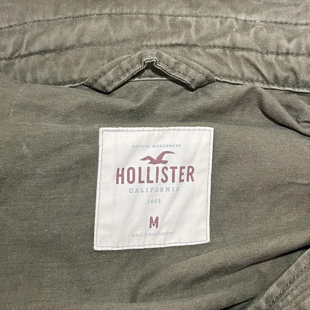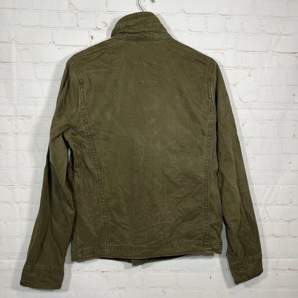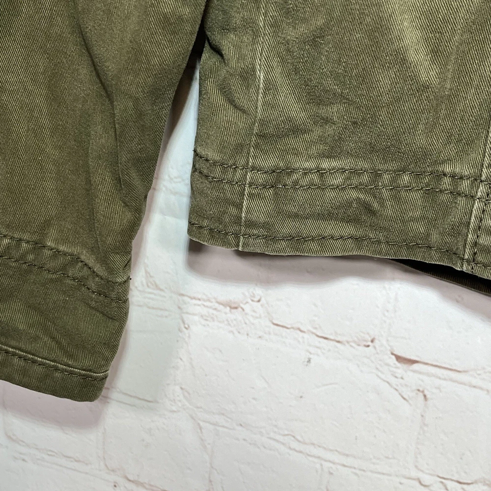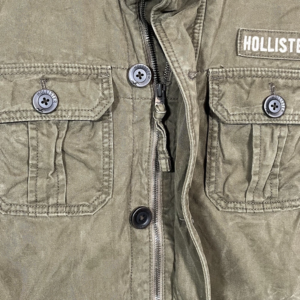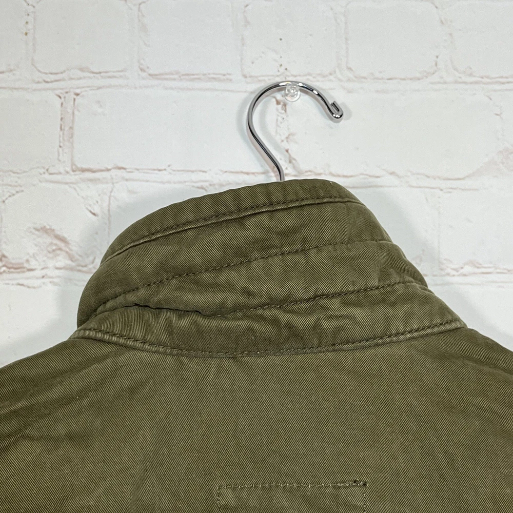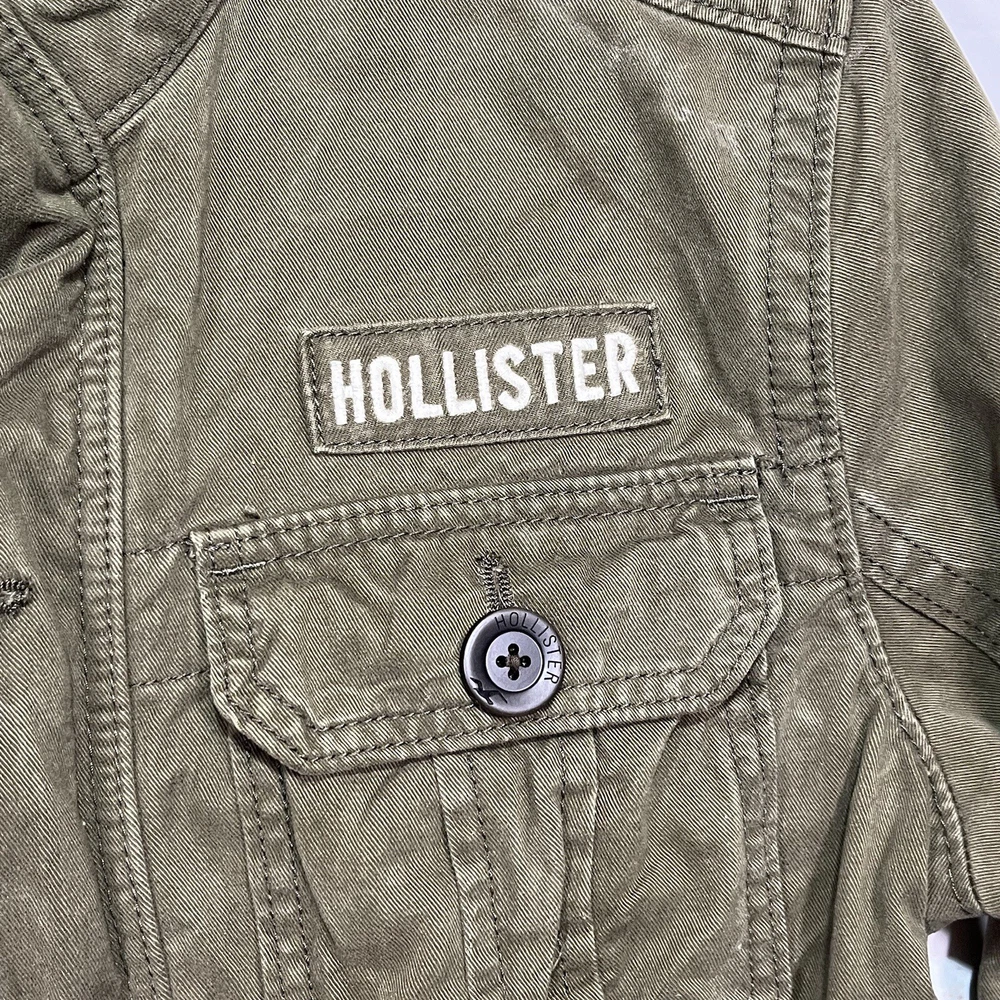 Hollister Utility Jacket Womens Medium Army Green Field Military Full Zip Button See measurements for accurate fit Shoulder to hem 26 inches Pit to Pit 21 inches All measurements are done flat lay Small mark on sleeve as shown