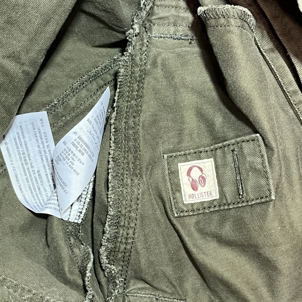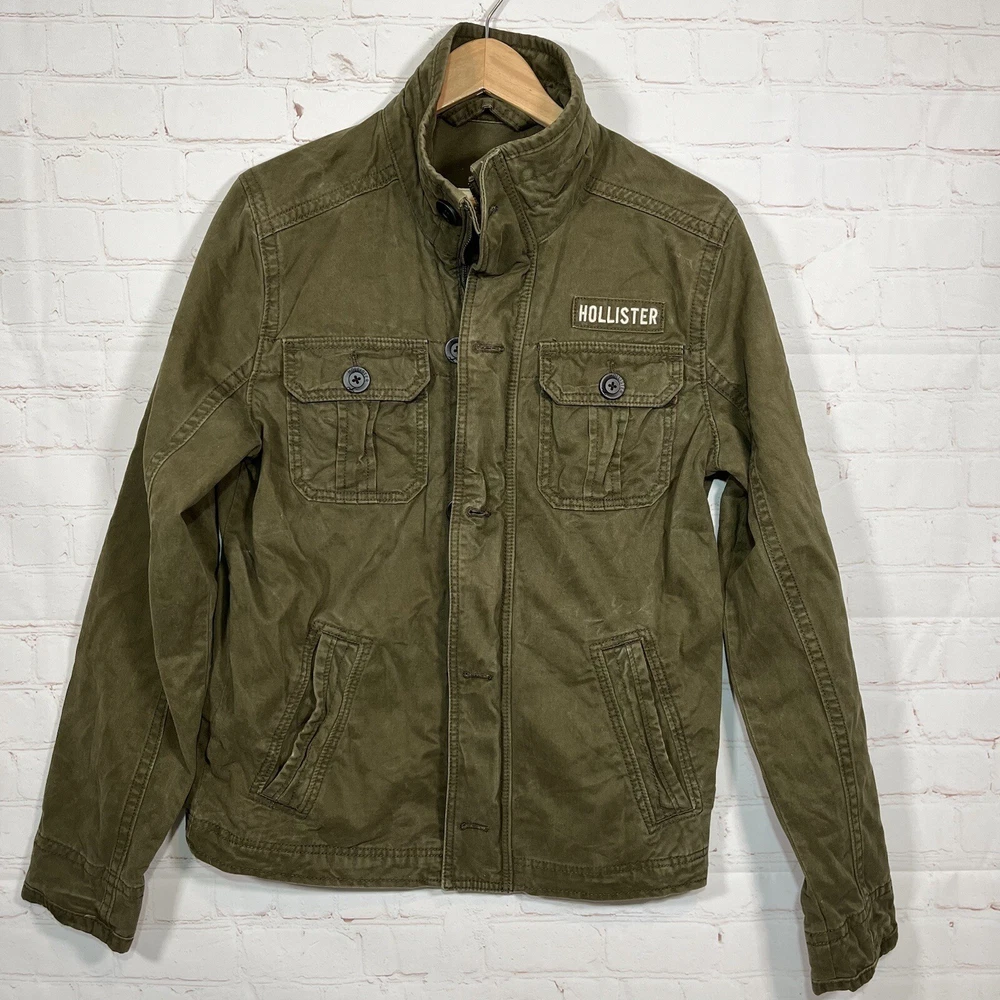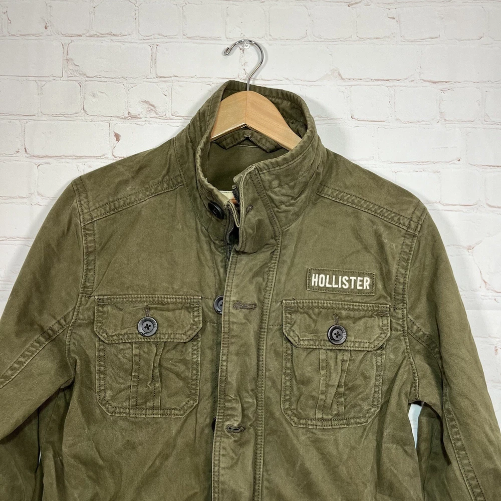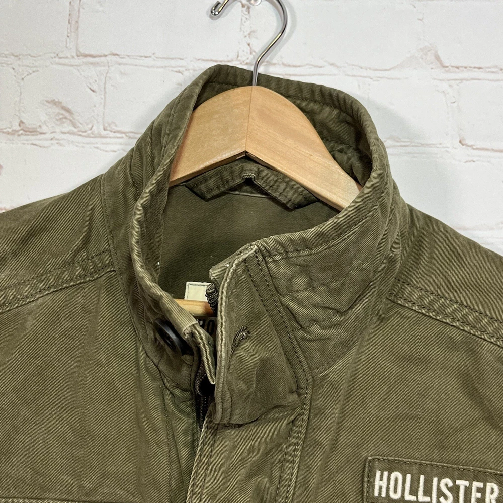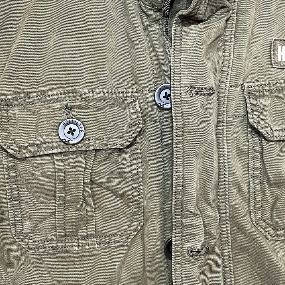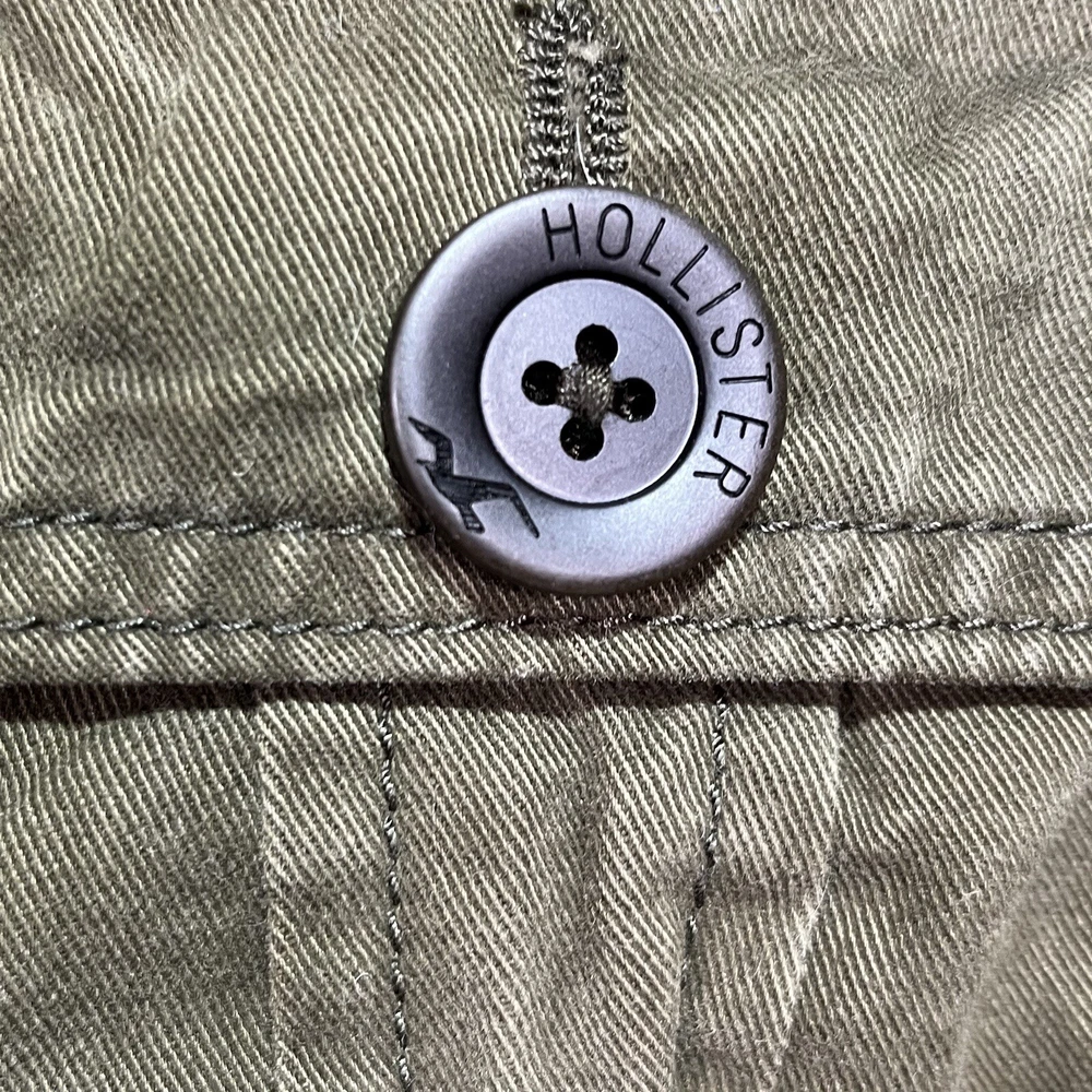 Hollister Utility Jacket Womens Medium Army Green Field Military Full Zip Button See measurements for accurate fit Shoulder to hem 26 inches Pit to Pit 21 inches All measurements are done flat lay Small mark on sleeve as shown