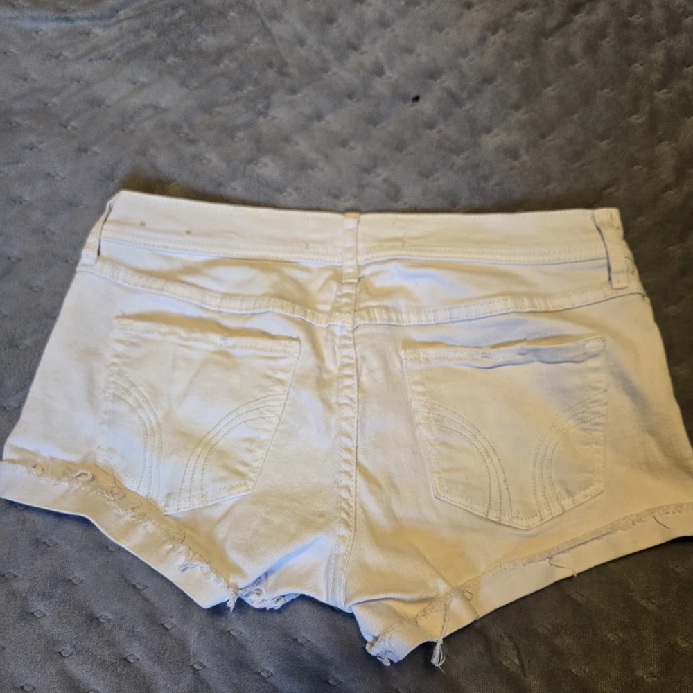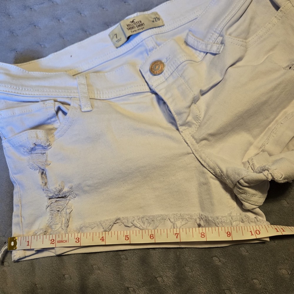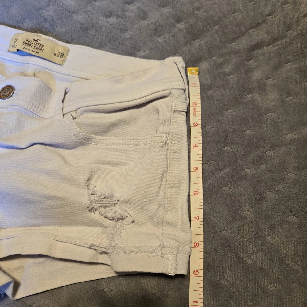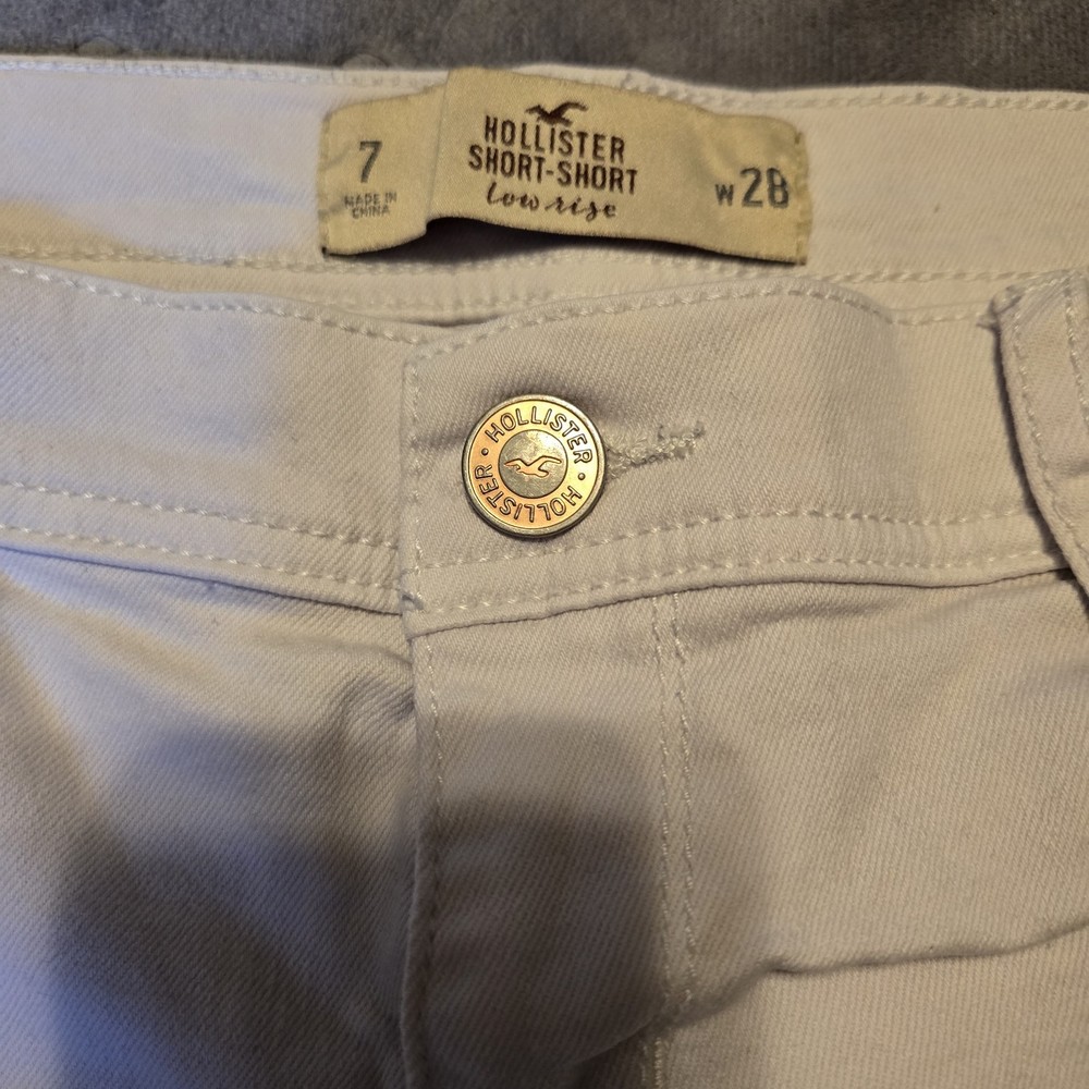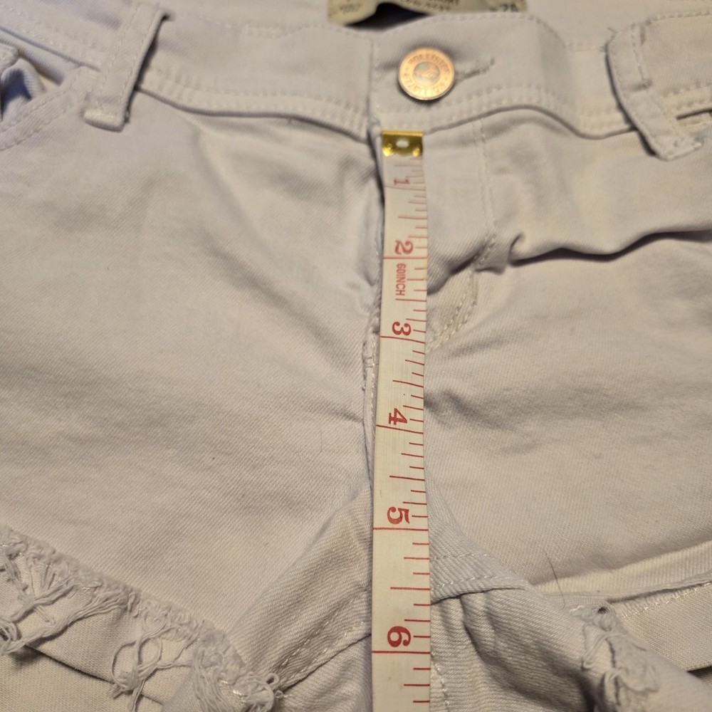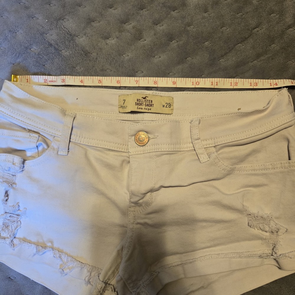 The Hollister Light Wash Distressed Cut Off Frayed Booty Shorts in size 7 are a stylish and comfortable choice for the summer season. Made from 99% Cotton and 1% Elastane, these denim shorts feature a low rise fit with a 2.0 inch inseam. The distressed detailing and button accents add a trendy touch, while the fraying and cuffed hem give them a unique look. These white shorts with a solid pattern are perfect for casual occasions and can be easily cared for with machine washing. Whether you're heading to the beach or just out for a casual walk, these Hollister shorts are a fashionable choice for your summer wardrobe.