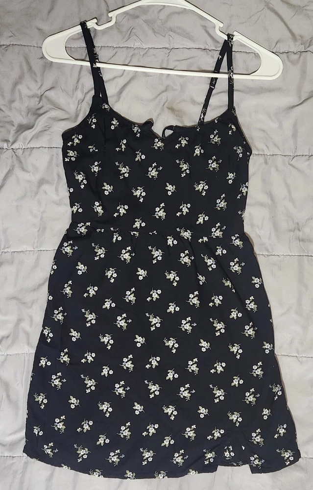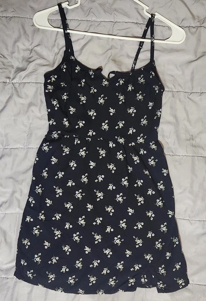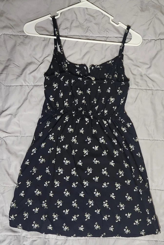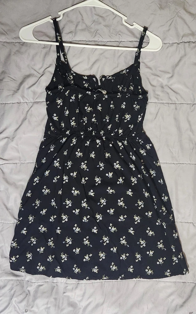 This Hollister women's dress is perfect for any occasion, whether it's a casual day out or a special event. The dress features a beautiful floral pattern in shades of blue and white, with spaghetti straps and a scoop neckline. It's made of lightweight knit fabric that's comfortable and stretchy, and has adjustable straps for a perfect fit. The dress is machine washable and easy to care for, making it a practical choice for any wardrobe. It's available in size M and fits regular size women. Whether you're going to a party, a holy communion, or just running errands, this dress is a versatile and stylish choice. This is in good condition and it's made from 100% viscose. The bust measures at 14 1/2', length is 26', and width is 29'.