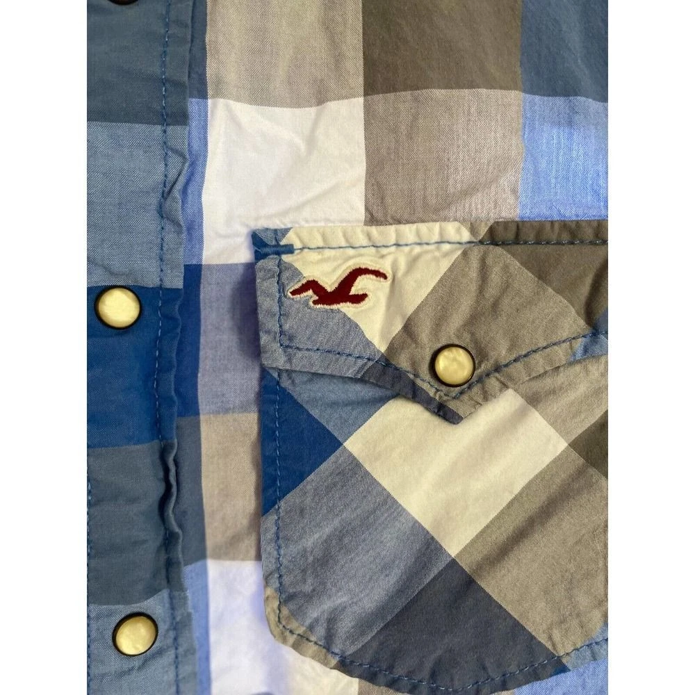 Elevate your style with this Hollister button-up shirt. The blue and white checkered plaid pattern adds a pop of color to your wardrobe and the embroidered accents provide a unique touch. This shirt features a collar and button-down closure, making it suitable for a variety of occasions including travel, parties, work, and casual wear. The M size shirt is made of a comfortable spandex and cotton woven fabric that is machine washable and easy to care for. With long sleeves and a button-down collar, this shirt is perfect for all seasons and can be paired with jeans or dress pants. Add this colorful and trendy shirt to your collection today!