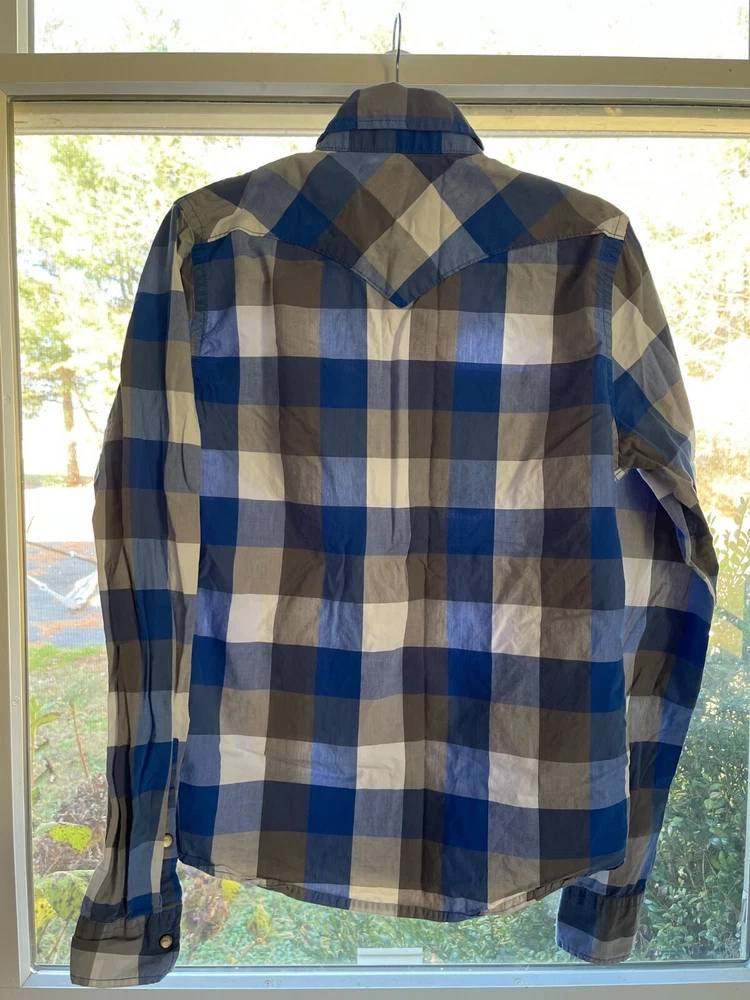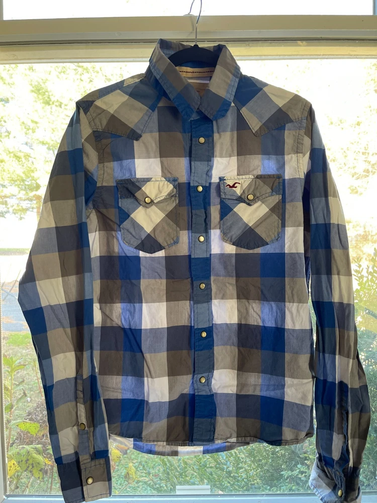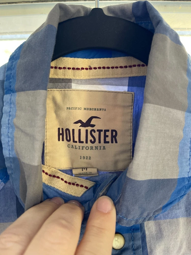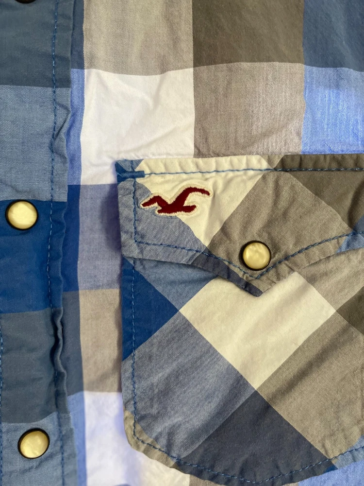 Elevate your style with this Hollister button-up shirt. The blue and white checkered plaid pattern adds a pop of color to your wardrobe and the embroidered accents provide a unique touch. This shirt features a collar and button-down closure, making it suitable for a variety of occasions including travel, parties, work, and casual wear. The M size shirt is made of a comfortable spandex and cotton woven fabric that is machine washable and easy to care for. With long sleeves and a button-down collar, this shirt is perfect for all seasons and can be paired with jeans or dress pants. Add this colorful and trendy shirt to your collection today!