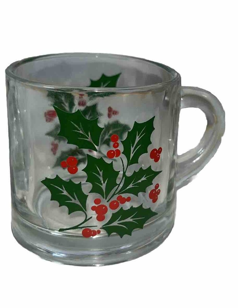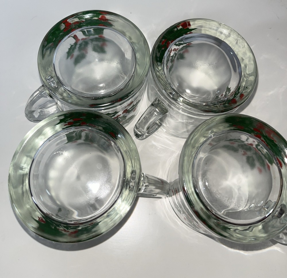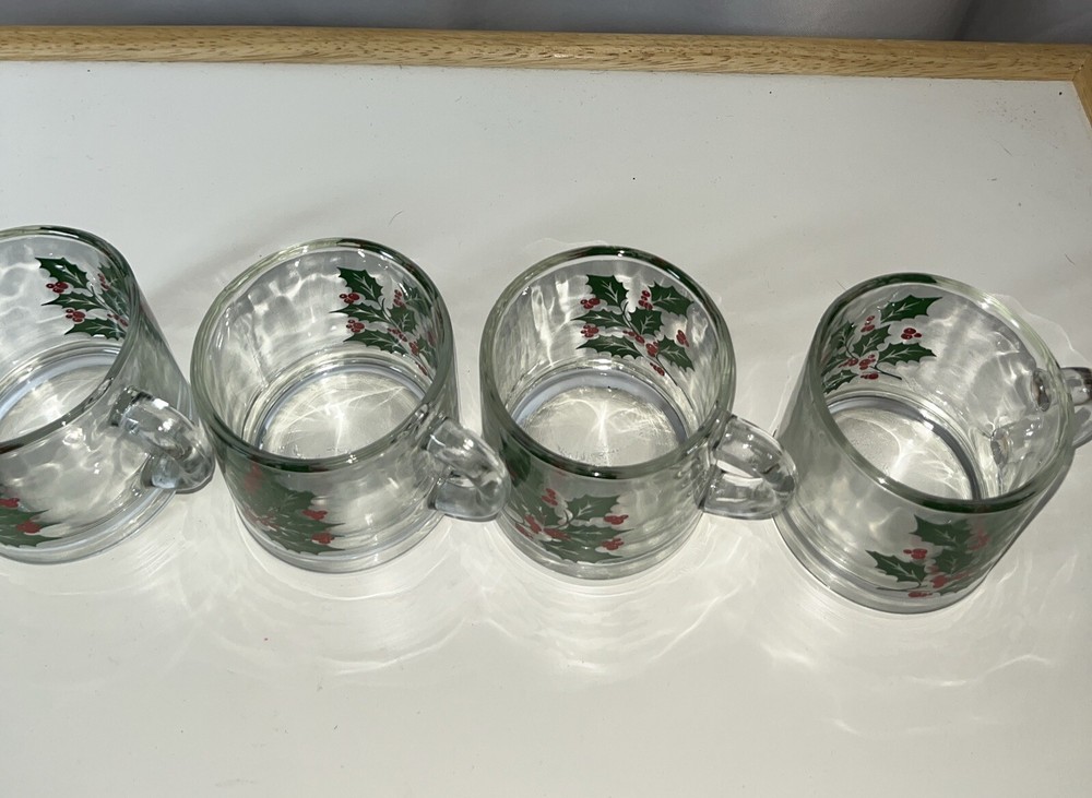 This vintage Holly Christmas clear glass mug set from Indiana Glass features a festive holly pattern, perfect for the holiday season. The set includes four 4 oz capacity mugs, made in the United States in the 1990s using pressed glass techniques. The clear glass material and Christmas theme make these mugs a charming addition to any holiday table setting or collection of collectible Christmas decor. Ideal for serving coffee, tea, or eggnog, this set is a delightful way to enjoy the spirit of Christmas throughout the year.