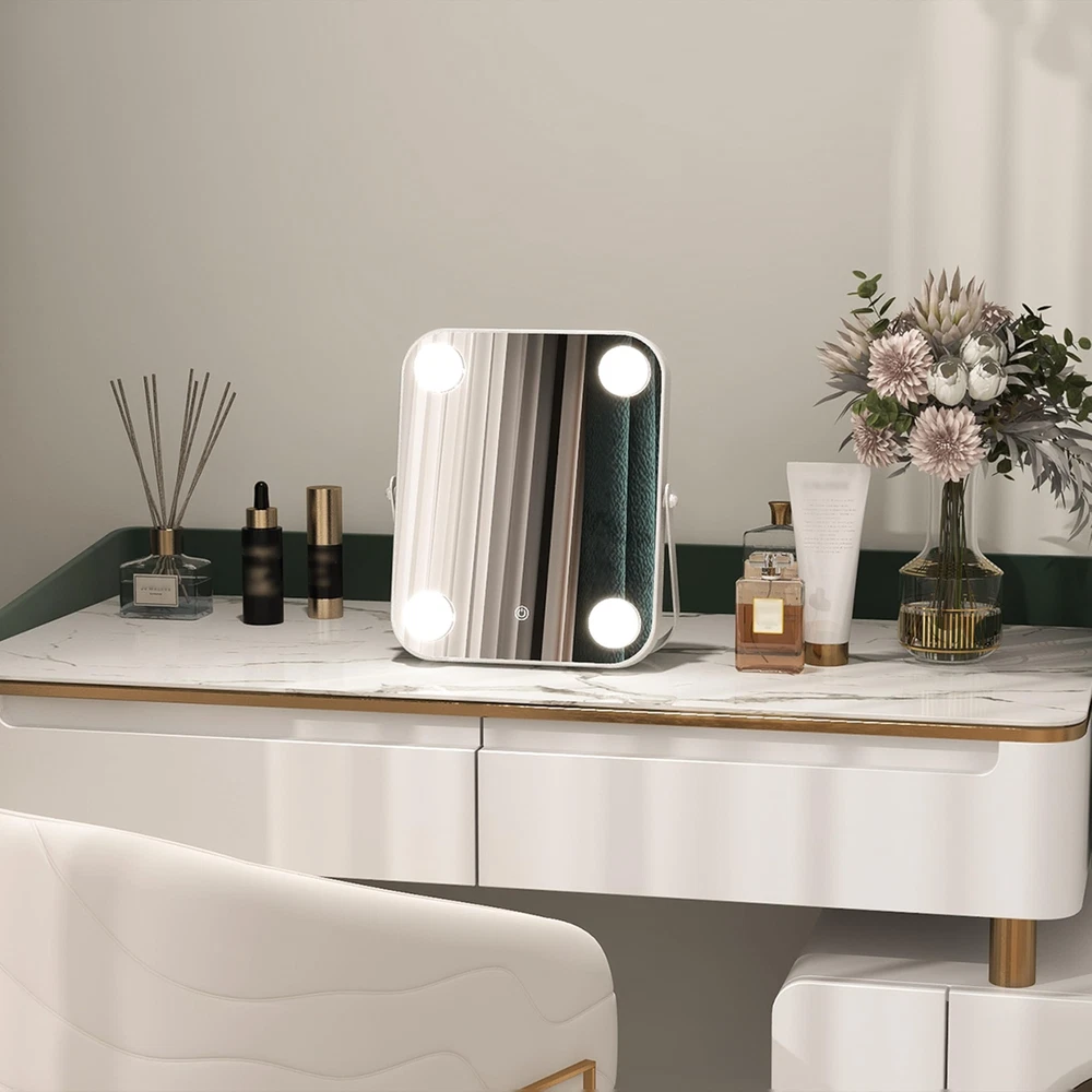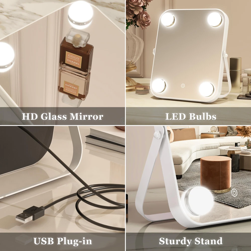 NOTE: It's NOT rechargeable! The mirror needs to be plugged into a USB socket in order to utilize the light function. 【Compact Size】 Our makeup mirror is designed with convenience in mind. Its compact dimensions of 8"x10" make it easy to carry and ideal for travel. Whether you're going on a weekend getaway or a business trip, this portable mirror won't take up much space in your luggage. 【Intelligent Dimming Function】 This vanity mirror with 4 LED dimmable bulbs. HD lighted mirror LED bulbs with more than 80,000 hours life span avoid trouble of replacing bulbs. You can customize the brightness to suit your needs. Adjust the brightness from dim to bright with just a button. 【Sturdy Stand and 360°Rotation】 Our light up mirror for desk features a robust U-shaped stand that provides stability and support. It ensures the mirror stays securely in place while you're using it. Additionally, the 360-degree rotation capability allows you to position the mirror at any angle you desire, making it convenient to use from various positions. 【Memorable Gift】 Looking for a thoughtful gift for a makeup lover? Look no further. Our Hollywood makeup mirror with its compact size, adjustable lighting, sturdy stand, and intelligent dimming function is an excellent choice. It combines practicality and style, making it the ideal gift for birthdays, holidays, or any special occasion. 【Premium Service】 We stand behind the quality of our product and offer premium service to our customers. Our lighted mirror has passed all tests, including dropping, impact, and heavy pressure tests. If you encounter any issues with your mirror, don't hesitate to contact us, and we'll make it right. Trust us to provide the best possible experience with our premium lighted mirror for vanity table.