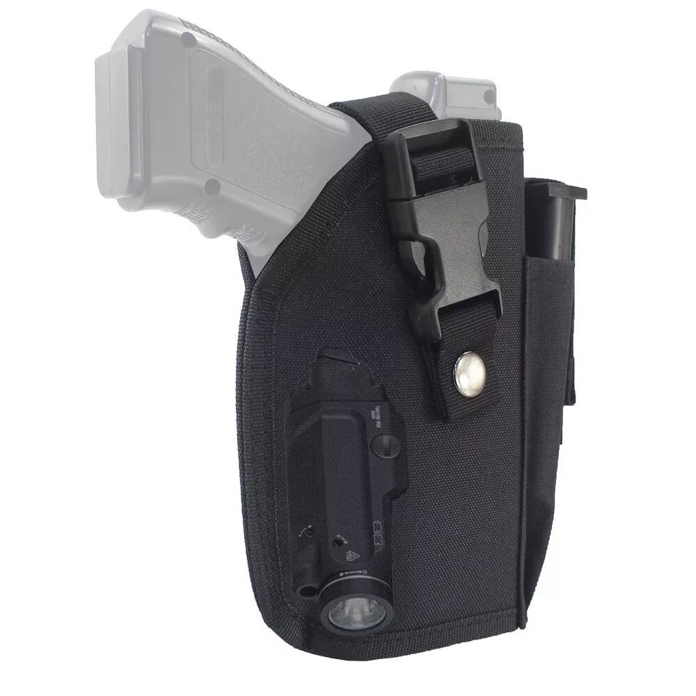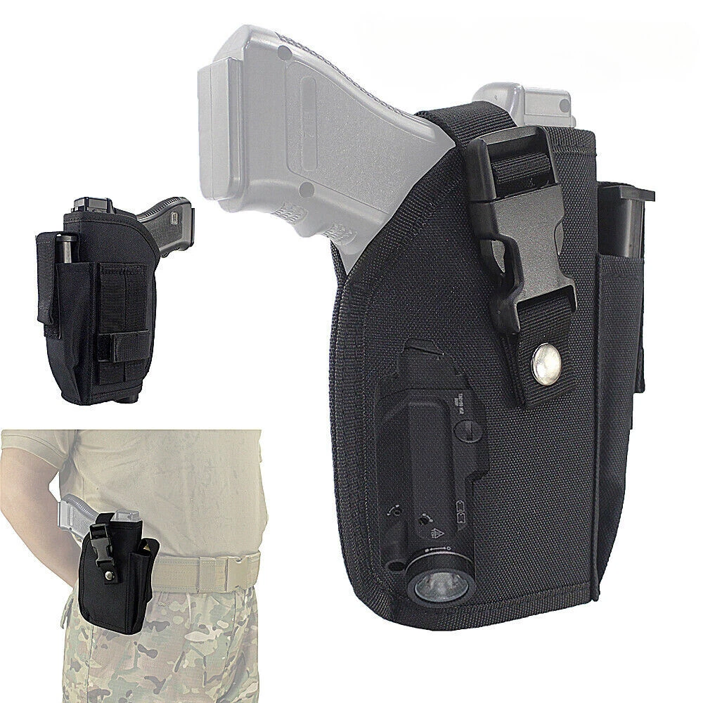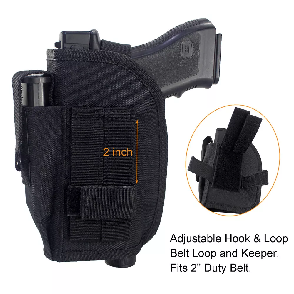 Store Categories Store Categories Bags and Pouch storage bag Tactical Bags Glasses Pouch Wallets Key Bag Molle Pouches Hats Hunting Outdoor Multi Tools Hunting Holster Hunting Pouches Laser and Riflescopes Scope Mounts Hunting Accessories Magazine Pouch Gun Slings & Belts Dog Supplies US STOCK Other Tactical OWB Holster for Gun with Laser or Light Attachment Handgun Belt Holster Product Description Fits handguns with under barrel laser or light attachment: Naturally fits handguns with laser or light NOT extend beyond the barrel, Cut the th re a d to fits laser or light extend beyond the barrel. Fits G17 G21 G22 R uger 9E SR Springfield XDm 4.5" 9mm Canik TP9 SA P89 Smith & Wesson M&P 9mm/.40/.45 Full Size ACP Beretta M9A1 9mm M9 A3 9mm PX4 92 FS H&K VP USP Taurus 9mm FN P99 PPX 1911 and many more pistols. High quality quick release buckle, Snap-On metal button and strong hook & loop straps. Fully adjustable and sturdy hook loop belt keeper for a secure fit to the belt, fit 2 inch heavy duty tactical belt. The extra pouch in the front is very useful for extra mag. Outside the waistband holster. For right hand use. Size: 7”*5.2”*2” (17.5cm*13cm*5cm) Weight: 4.06 oz (115g) Color: Black Package Content: 1 x Belt Holster Shipping Policy Returns Policy About US Shipping Policy Item will be shipped within 1 working days after received payment. USPS : USA 7-15 working days to arrive Air mail : 15-25 working days to arrive (other countries) Express Delivery: 7-10 working days to arrive NOTE: If you need your items urgently, we can ship it out by Express Shipping,but you need to charge extra fees. Returns Policy 1. We fully guarantee our items. All items are in brand new condition unless specified otherwise elsewhere in the description. 2. All returns - defective or otherwise - have to be preauthorized. Please contact us to get an authorization and returning address before sending the item back. All returned items must include original packaging and all accessories. 3. We will pay for the shipping cost of re-sending items to you, while buyers are responsible for the postal cost of returning the items. About US Our office hours are: 9:00 a.m. to 6:00 p.m. (GMT+8), Monday to Friday,And our office is closed on weekends and public holidays. Message replying will sometimes be delayed. If you have any question or needs, please let me know.We will reply to you within 24 hours.
