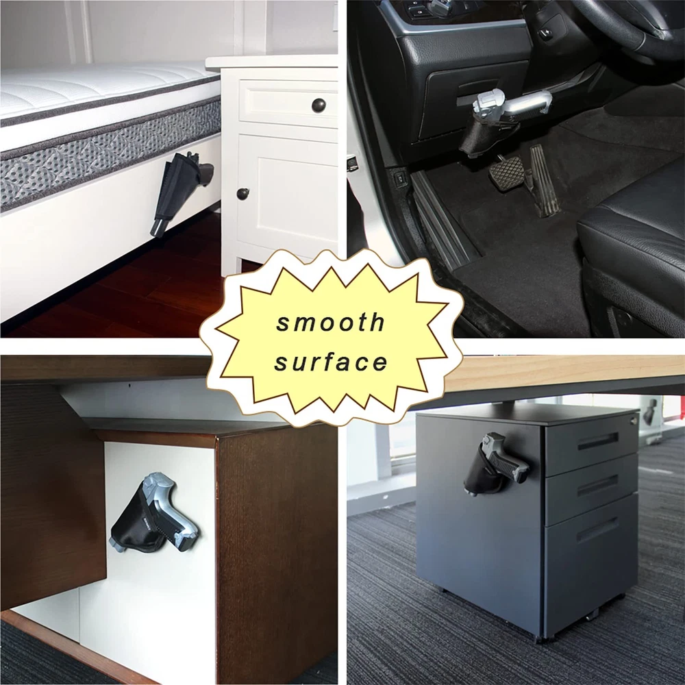 Holster with Adhensive Backing,Safe Accessories Handgun Holster Storage Solution Mount Inside Safes Door DURABLE MATERIAL: The safe holder is made of reinforced Oxford fabric, Strong and lightweight for use forever UNIVERSAL SIZE :6''H*4-3/4''W, Suitable Size to fits any handgun,pistols and revolvers and keep them from being dropped or damaged! TIME SAVING : Put and draw quickly from the safes door back panel ,perfect safe asseccories. WAYS OF INSTALLATION : Adhesive tape with super sticky,Suitable for smooth surfaces Such As steel cabinet, wood board, glass, ceramic tile,marble,etc; Also with the hook and loop tape it can use in safe with Carpet TIPS:Please make sure no moisture, grease or dust on the smooth surface before Sticking.
