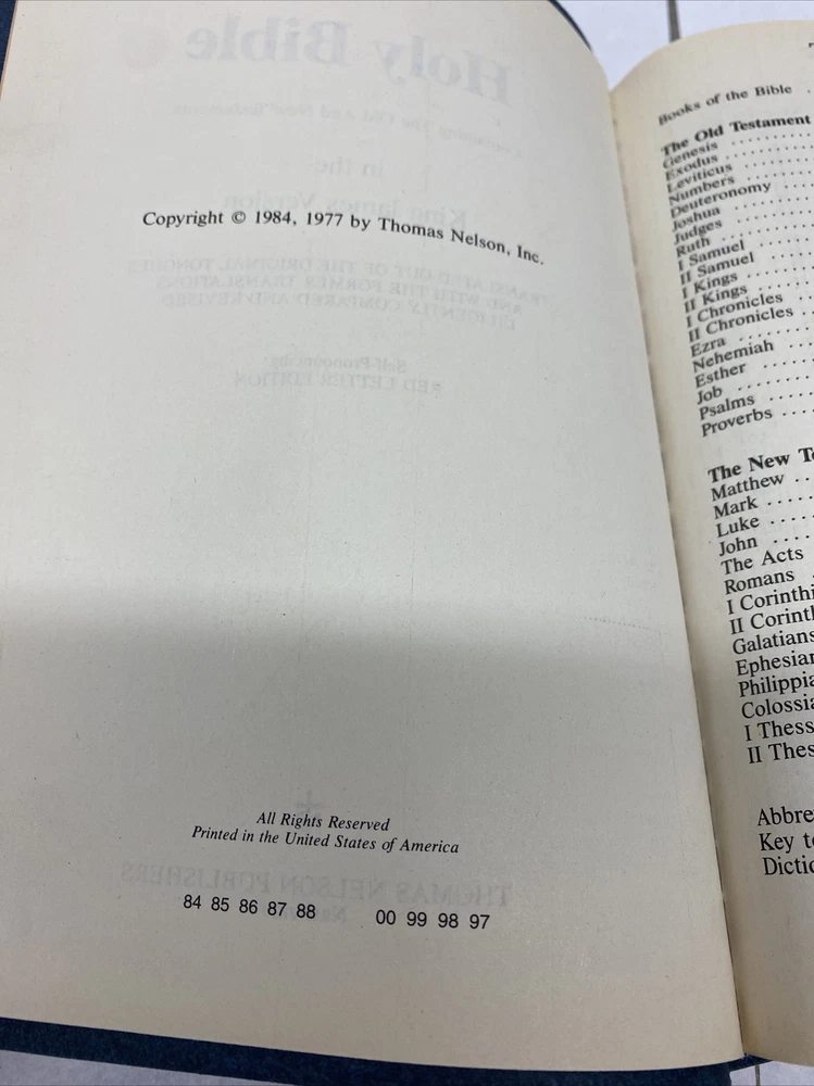 Holy Bible Dictionary Concordance Red Letter Edition King James KJV Nelson 1984. Does have name marked out on first page. Rest of book in great condition.