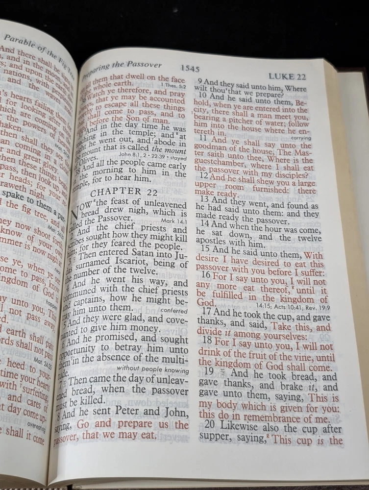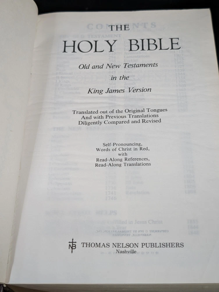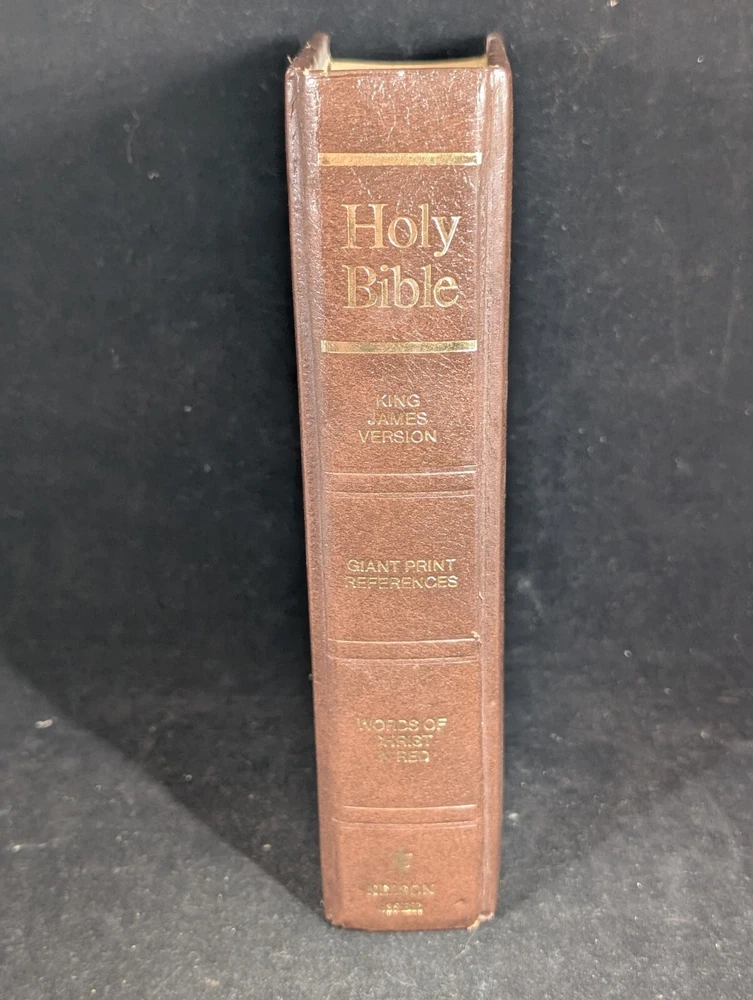 This is a hardcover padded Holy Bible in English, published by Thomas Nelson Inc. in 1976 in Nashville, Tennessee. It features giant print references and red letter text, with the author being Thomas Nelson Staff. The Bible is a reference book on Christianity with an original format, and it was manufactured in the United States.
