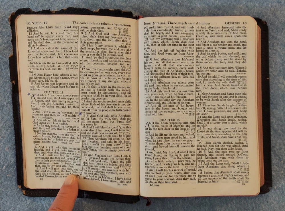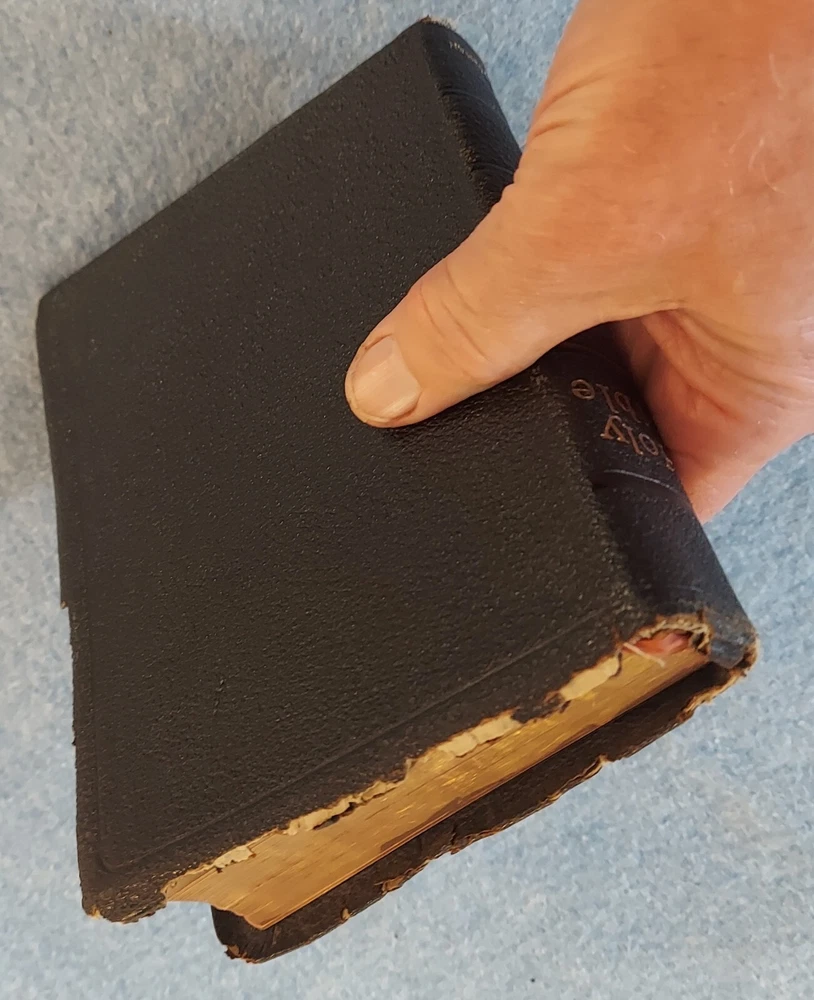 Holy Bible King James Version KJV Genuine Leather Holman Verse Ref Jewel 1942 Simplified Pronouncing THE HOLY BIBLE CONTAINING THE OLD AND NEW TESTAMENTS TRANSLATED OUT OF THE ORIGINAL TONGUES AND WITH THE FORMER TRANSLATIONS DILIGENTLY COMPARED AND REVISED THE TEXT CONFORMABLE TO THAT OF THE EDITION OF 1611 COMMONLY KNOWN AS THE AUTHORIZED OR KING JAMES VERSION HOLMAN COMPANY Verse References JEWEL 16mo Clearface India Paper Copyright 1942 Printed in the U.S.A. Cover: GENUINE LEATHER, black Size: 5 ¾ x 8 ¼ x 1 ¼ inches Pages: Old & New Testaments, 1280; Index to the Atlas to the Bible, 8; Color Atlas to the Bible, 12 See the photo with the coin to judge the size of the print. Features Topical page headings References (in-text cross-references, translation notes) Color Bible Atlas Gold-gilt on page edges This vintage Bible is in good condition, though the edges of the cover are fragile with some broken areas. The name of a previous owner is written and stamped on the second page. Marks are observed on just four pages, small marks in the margins. The binding is good and tight. The cover has just light wear, except around the edges. The overlapping edges are worn and broken off in some areas. There is wear at the top and bottom of the spine. The gold finish on the page edges is a bit worn and scuffed.