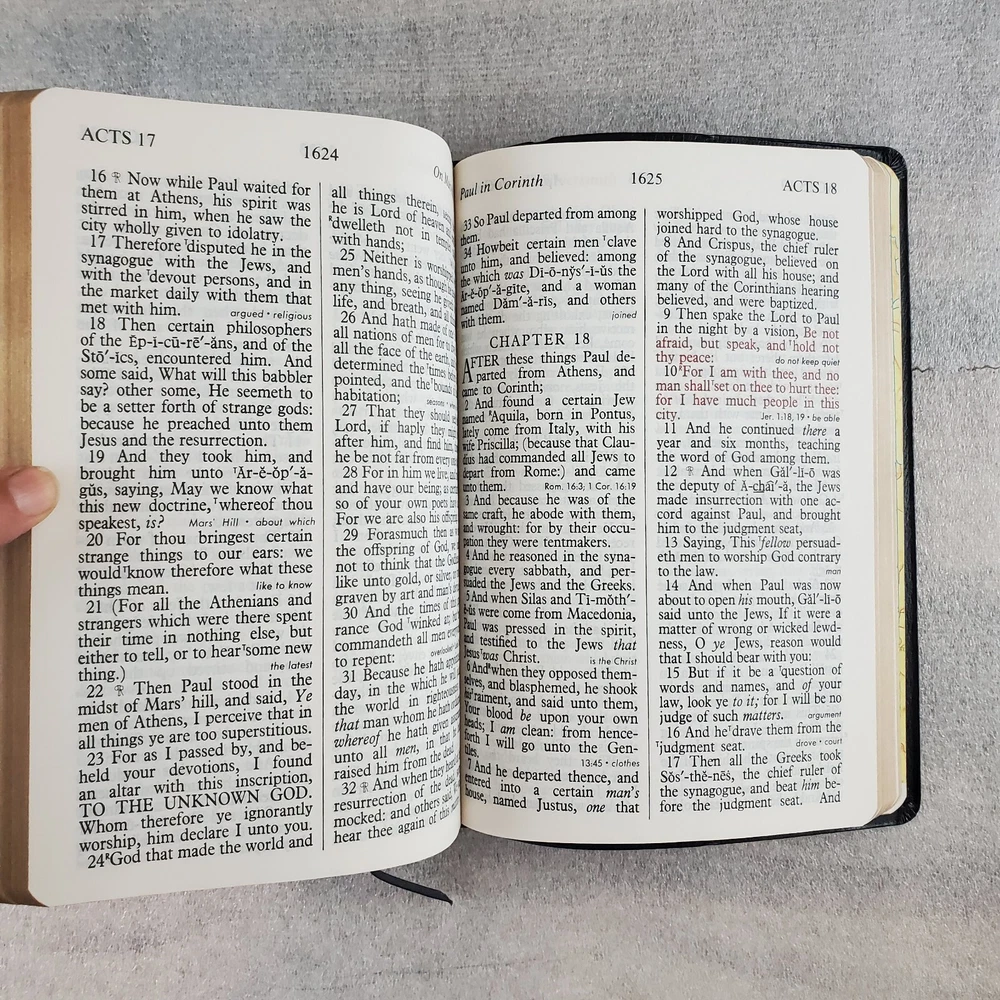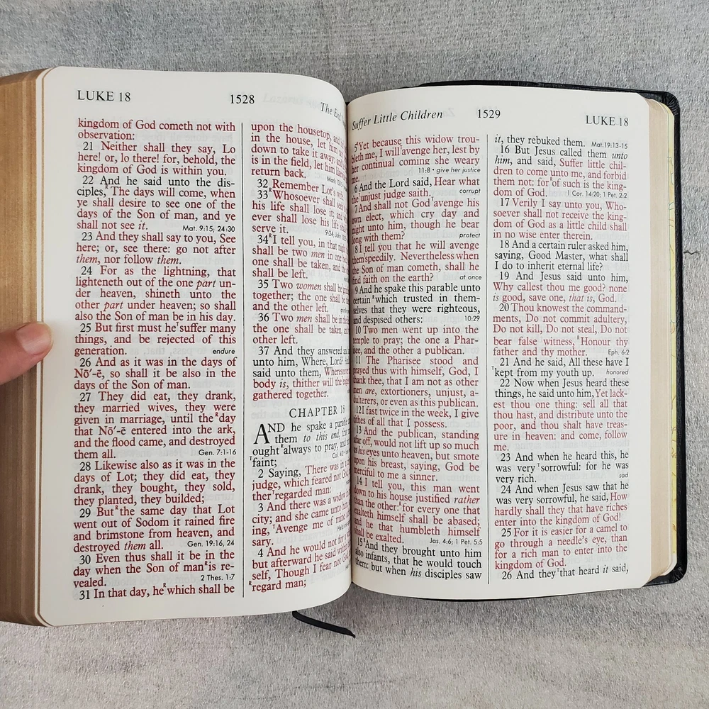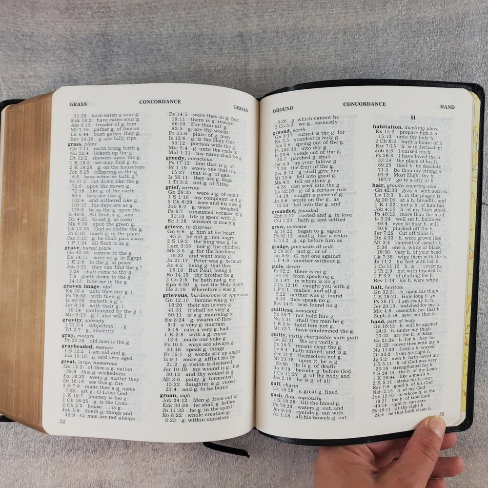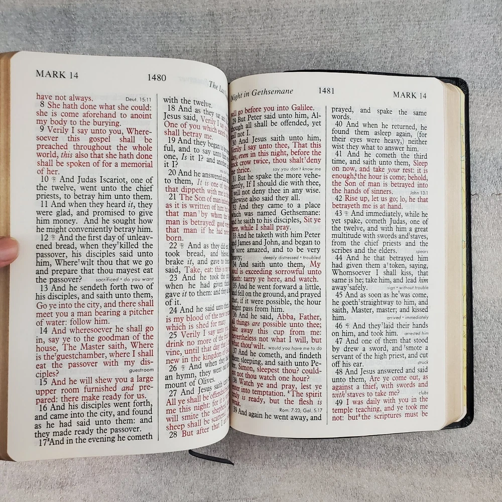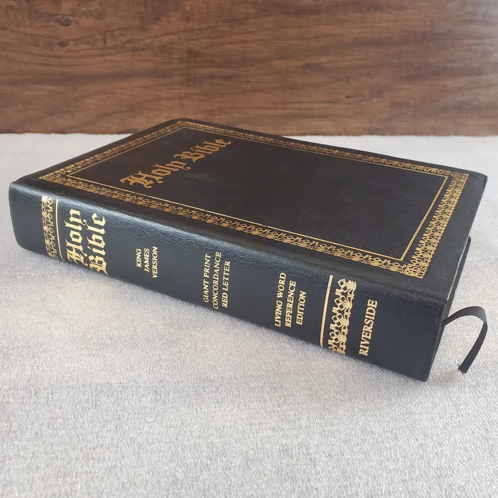 Holy Bible Living Word Riverside Giant Print Concordance Red Letter Reference Ed Opening page is a little loose from the edge (see photo). There is a small bit of wear to the cover. No writing, highlighting, underlining or marking found flipping through the book. Pages appear clean. Please view the photos carefully for condition details. Don't forget to check out the other items in my shop. I'm getting in new fun things all the time. Thank you for looking! Have a great day!