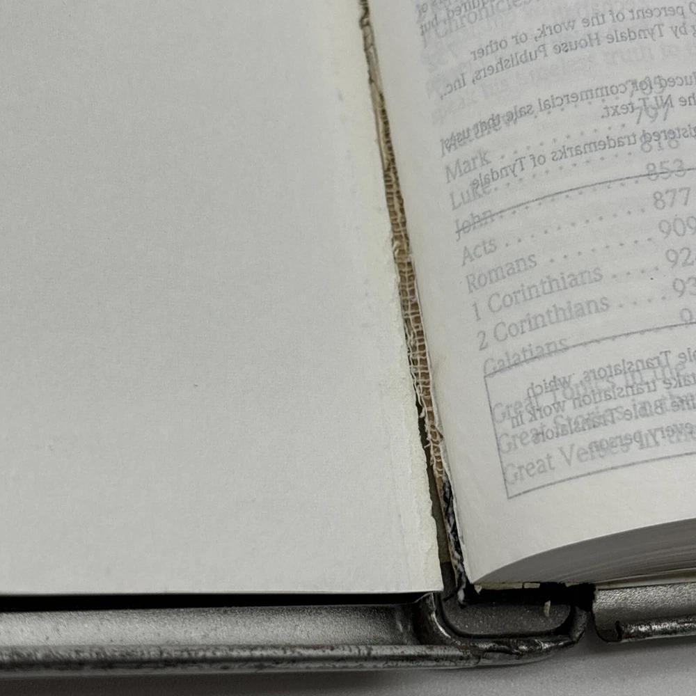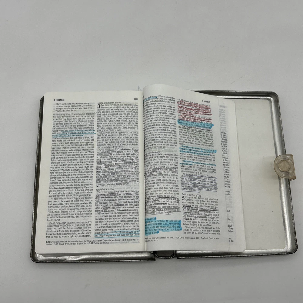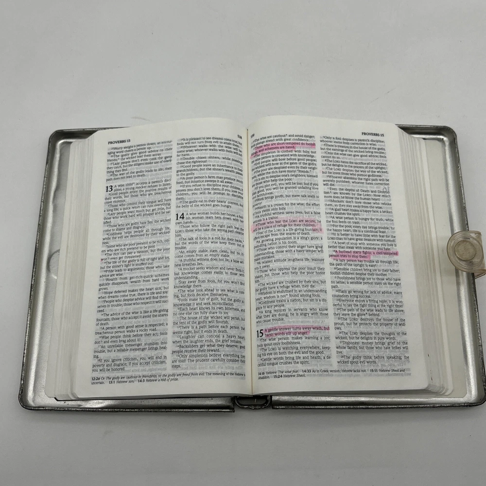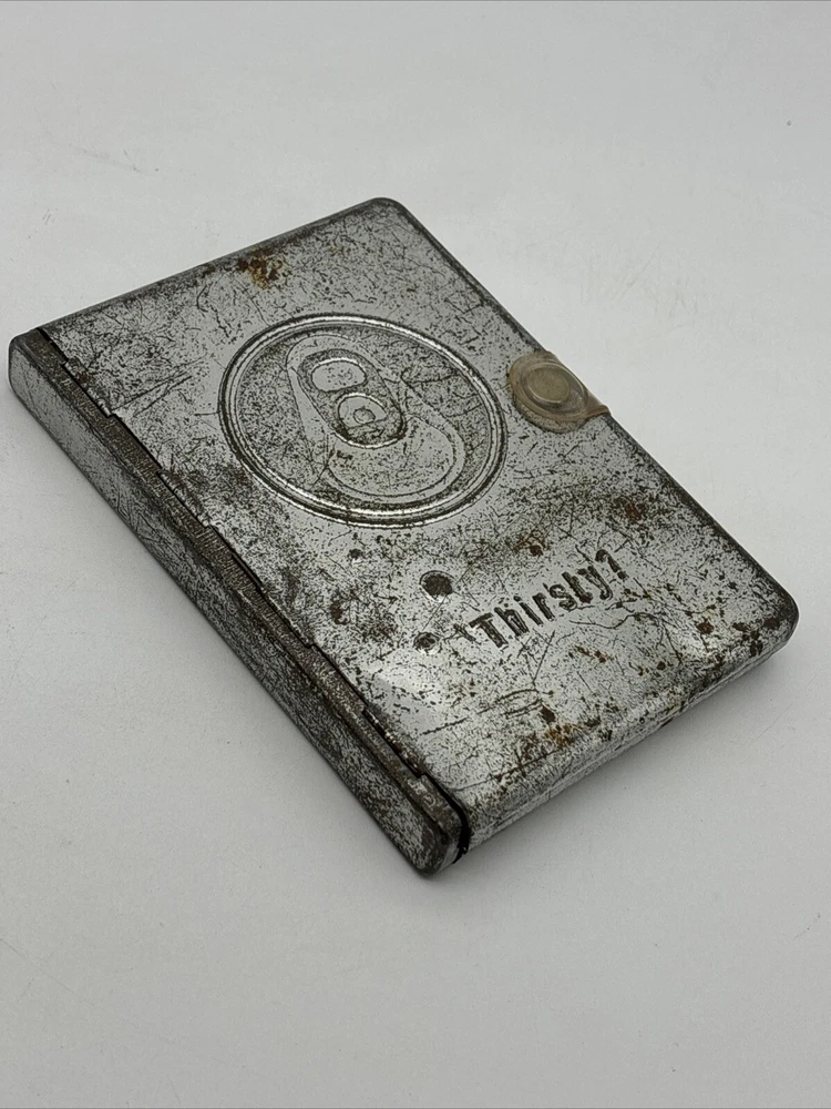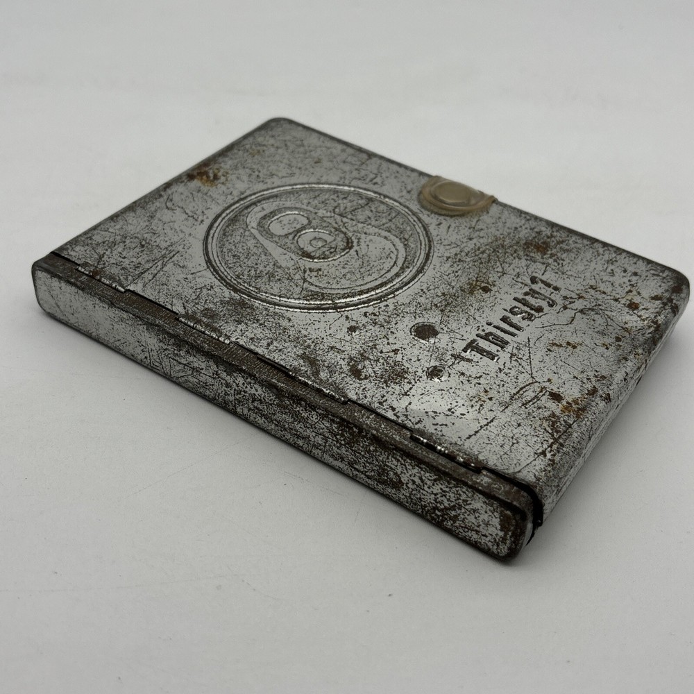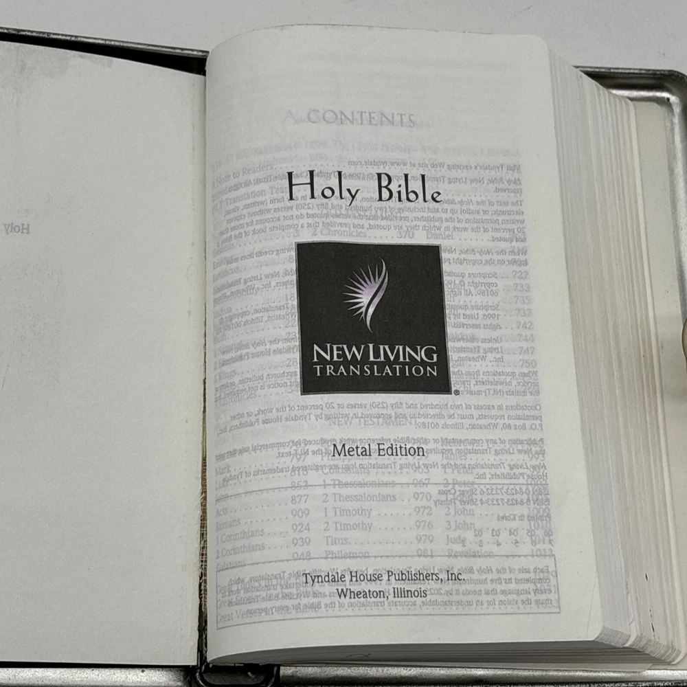 Metal edition of the new living translation. Bible features a metal clamshell cover with a magnetic clasp. The metal cover has an image of a pop top can and the word Thirsty? on the front. The cover has a few dents, numerous scratches, and lots of surface rust. Inside, the Bible has broken binding, and has had an attempted repair with duct tape. Please see pictures. There is some underlining and some pencil marked versus, as well as some notes in the back. Also, several of the pages have folded corners. This Bible appears to have been well used and has been through a lot, but with its durable metal cover, it can probably go through a lot more.