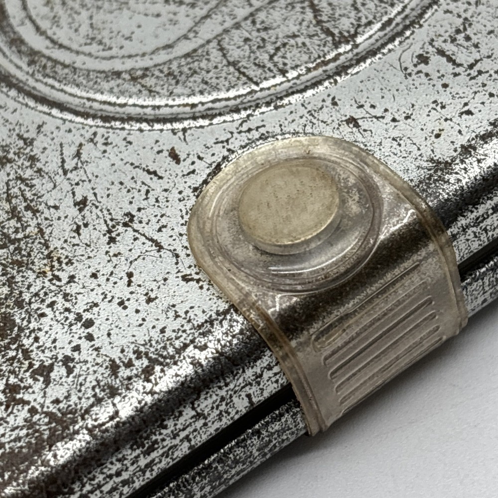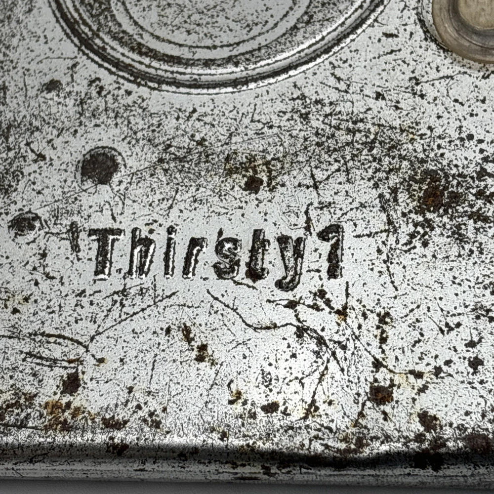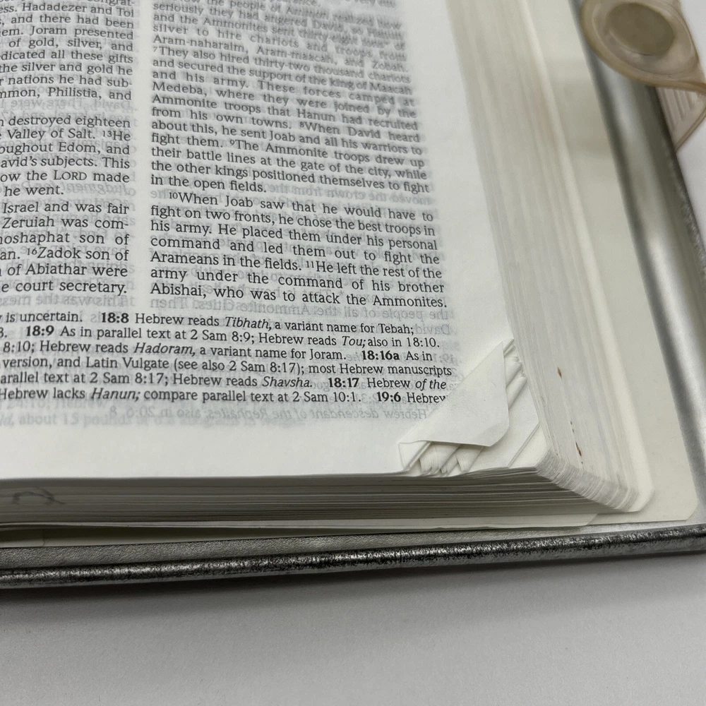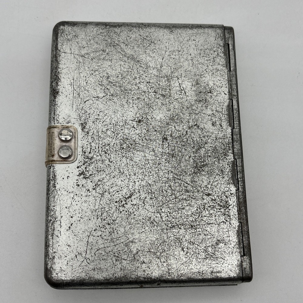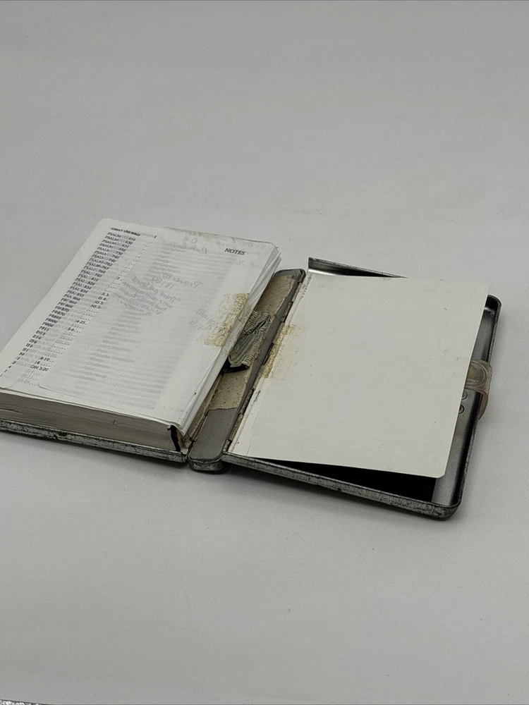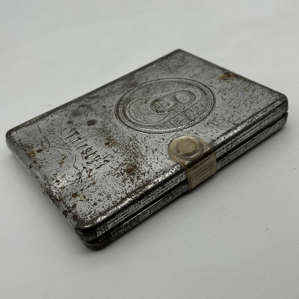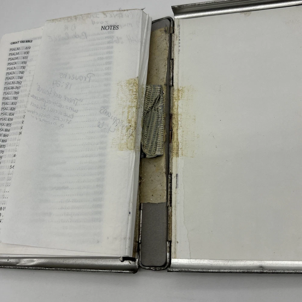 Metal edition of the new living translation. Bible features a metal clamshell cover with a magnetic clasp. The metal cover has an image of a pop top can and the word Thirsty? on the front. The cover has a few dents, numerous scratches, and lots of surface rust. Inside, the Bible has broken binding, and has had an attempted repair with duct tape. Please see pictures. There is some underlining and some pencil marked versus, as well as some notes in the back. Also, several of the pages have folded corners. This Bible appears to have been well used and has been through a lot, but with its durable metal cover, it can probably go through a lot more.