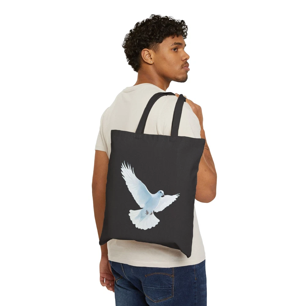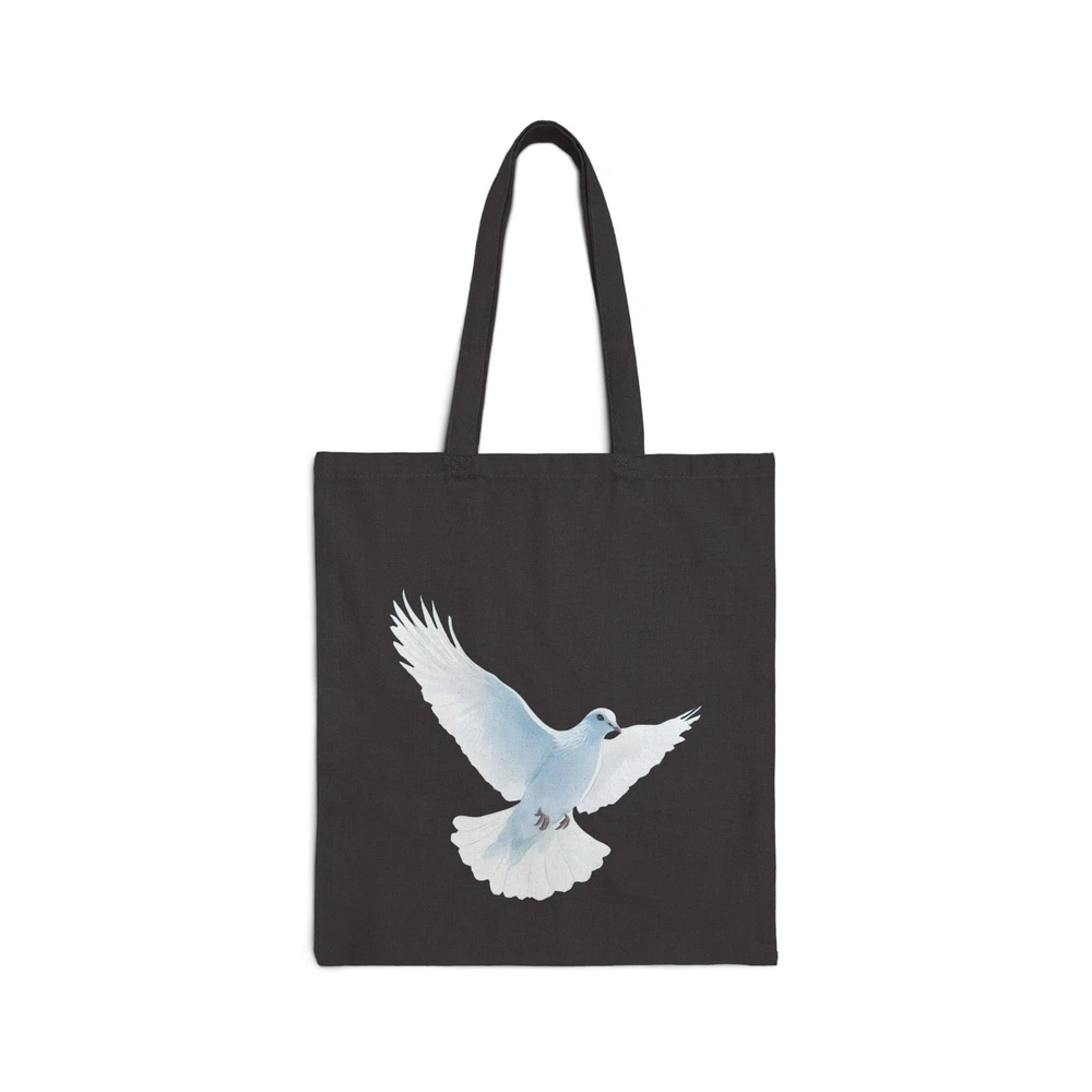 A quietly elegant canvas tote that carries calm with you. Heavy 12 oz cotton holds its shape and the things you need, while long self-fabric handles sit comfortably on your shoulder. A soft, watercolor dove drifts across the front — airy, hopeful, and subtle against natural canvas. The flat-corner construction keeps the silhouette slim so it tucks under an arm or into a bike basket without bulk. Bring it to small rituals and everyday routes: the farmers’ market, a library visit, or a thoughtful house visit when you want to arrive with something gentle. Product features - 100% heavy 12 oz cotton canvas for durability and structure - Flat-corner construction for a slim, tidy profile - Long self-fabric handles with reinforced stitching for comfortable carrying - Sewn-in label; sourced blank from India - Available in natural and black; adult size Care instructions - Do not iron directly over the printed area - print may stick to the iron. - Spot clean - Do not bleach - Line dry Made to order Each item is made to order to ensure the highest print quality. Please double-check all details (such as size or device model) before placing your order. Shipping • Production time: 1–3 business days • Carefully packaged for safe delivery Returns & issues Because this item is made to order, returns or exchanges are not accepted unless the item arrives damaged or defective. If there’s any issue with your order, please contact us and we’ll make it right. EU representative : HONSON VENTURES LIMITED, 3, Gnaftis House flat 102, Limassol, Mesa Geitonia, 4003, CY Product information : Liberty Bags OAD113, 2 year warranty in EU and Northern Ireland as per Directive 1999/44/EC Warnings, Hazard : Blank product sourced from India, For adults Care instructions : Spot clean, Do not bleach, Line dry, Do not iron directly over the printed area - print may stick to the iron.