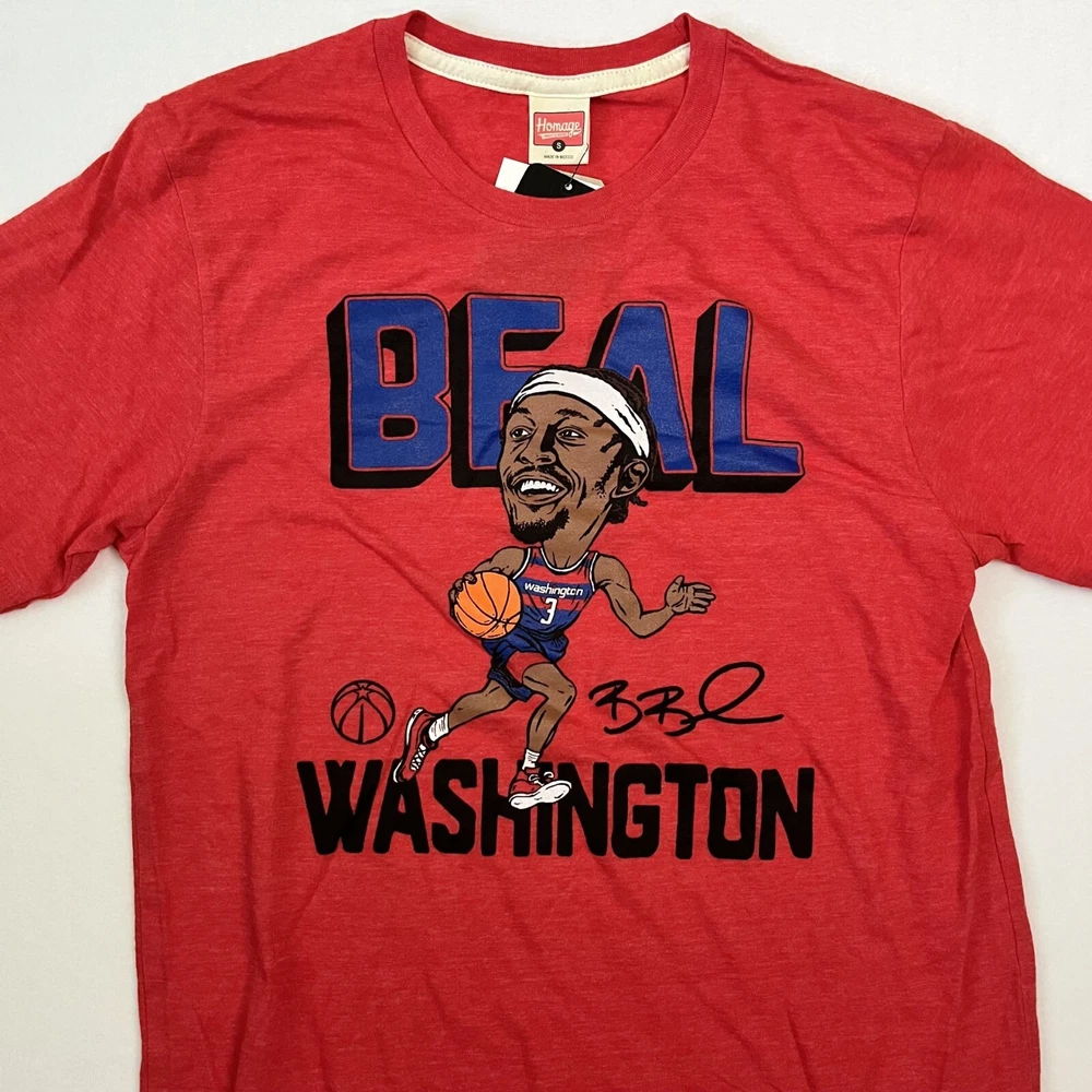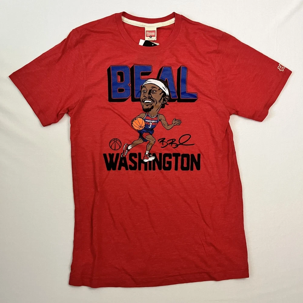 Enjoy wearing this stylish, comfortable Bradley Beal T Shirt and show your friend who you support! Or, buy it match your outfit for the night. Either way, you will love this great-looking banger of a shirt! Colorful Bradley Beal Cartoon Character on the front of this red shirt. It is New With Tags and ready to wear! Bradley Beal Washington Wizards T Shirt Red, NWT Company: Homage Condition: New With Tags Color: Red body with colorful graphics Style: Classic Fit Sleeves: Short sleeve Collar: Crew neck Material: Cotton blend Size: S (Small) Sleeve Length: Short Sleeve Shirt Length: 28.5” (from base of collar to bottom of shirt) Shirt Width: 18” (from pit to pit) Wash Instructions: Machine Wash Inv. 0038
