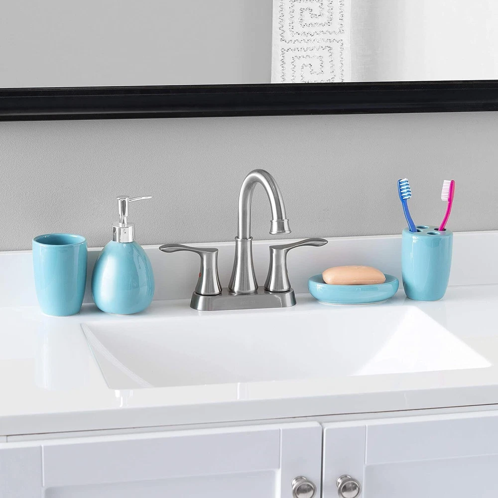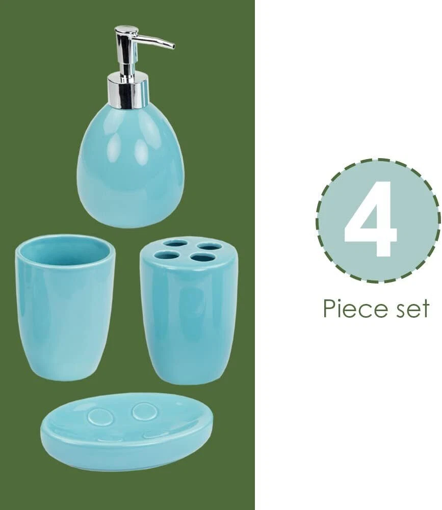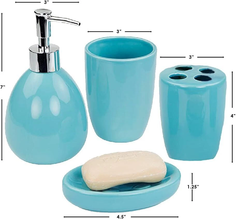 eBay Home Basics 4-Piece Bathroom Accessory Set, Includes Soap/Lotion Turquoise Product Details Material: Ceramic Color: Turquoise Brand: Home Basics Style: Contemporary,Modern,Elegant Included Components: Toothbru 100% Ceramic FULLY FUNCTIONAL 4 PIECE BATH ENSEMBLE: 4 Piece bathroom accessory set adds style and function to the counter or vanity with its durable ceramic material and beautiful sleek finish. PERFECT FOR ANY DÉCOR: Solid hue adds a cohesive look to any bathroom décor. GREAT FOR ANY OCCASION OR ANY SETTING: Artfully arrange each piece on a serving tray (sold separately) for an effortlessly elegant bath set up that is both functional and stylish. The four piece bath is perfect as a housewarming present, wedding gift, or anyone looking to equip their bath with a set of accessories that are practicable DESIGNED TO LOVE AND LAST: Made of durable ceramic, each piece is offers smooth-to-the-touch surface that feels sumptuous in your grasp. Sturdy stainless steel pump on the lotion dispenser is designed to be rust-proof EASY TO CLEAN: Smooth finish makes it easy to wipe down or hand wash residue