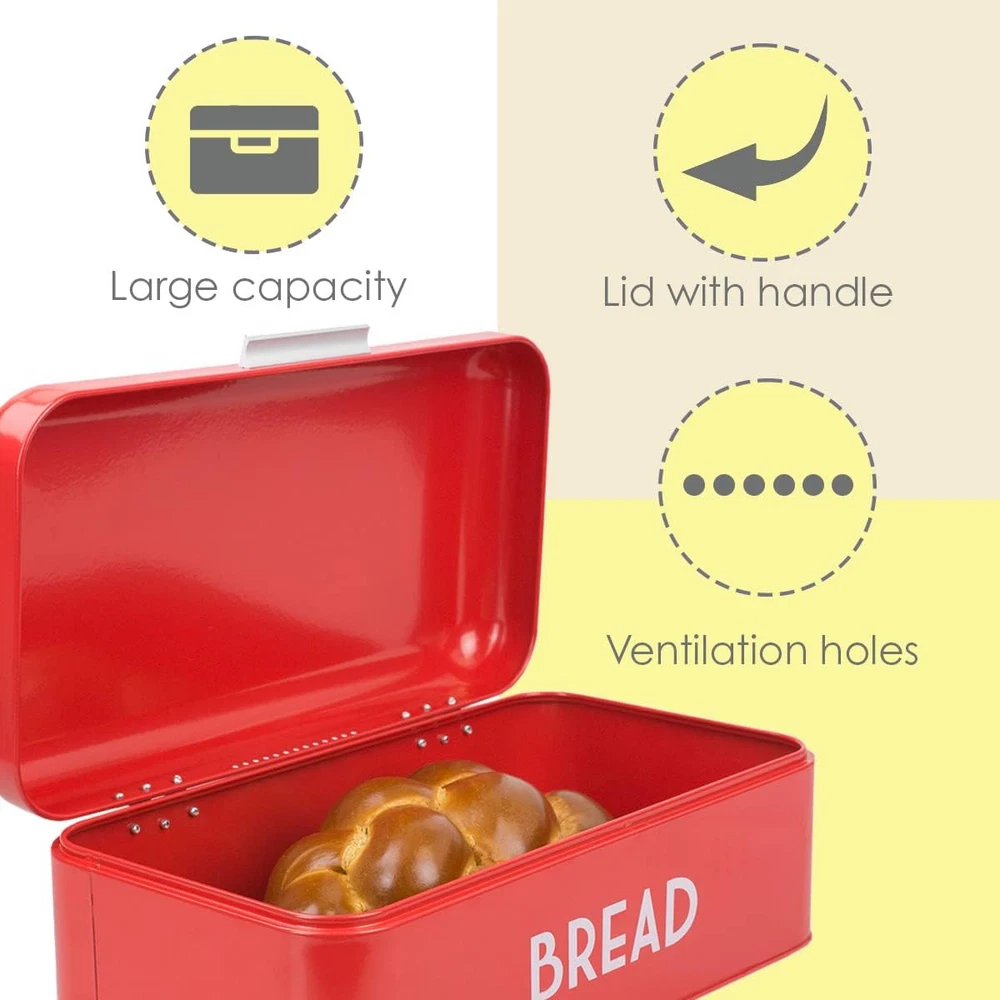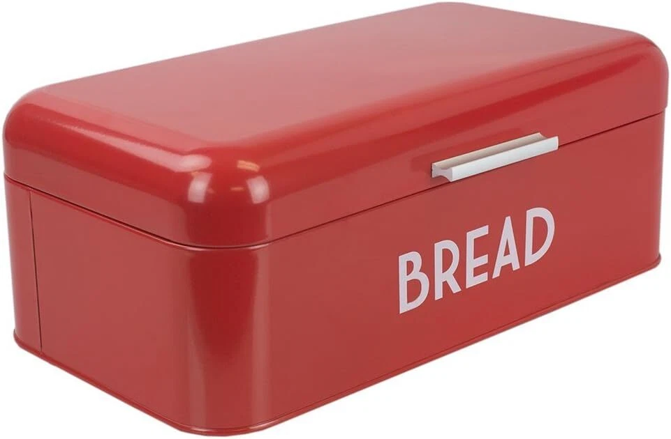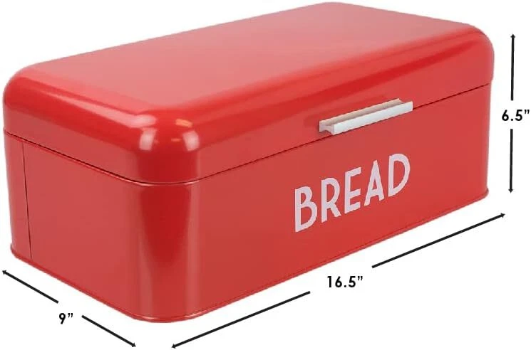 Home Basics Grove Bread Box For Kitchen Counter Dry Food Storage Red Product Details Brand: Home Basics Color: Red Material: Steel Material Feature: Durable Product Dimensions: 16.89"L x 6.5"W x 9.5"H MODERN AND RETRO COUNTERTOP STORAGE WHILE TAKING MINIMAL ROOM: Give a classic yet modern appeal to your kitchen space with our stylish bread box. The red color & retro aesthetic of our bread keeper will help elevate your kitchen countertop into a chic one, while taking a small amount of room on your busy countertop HOLDS BREAD ROLLS AND OTHER BAKED GOODS: This large bread box can comfortably fit two to three rolls of bread inside, or it can provide storage for other baked goods such as croissants, bagels, cookies, and more DURABLE METAL STRUCTURE WITH VENTILATION HOLES: This box for bread is made from premium-grade, sturdy metal for ultimate durability. And if the bread box is accidentally dropped, it won’t chip or dent easily. Located at the back of the box, there are ventilation holes that provide proper air circulation EASY ACCESS TO YOUR FAVORITE SNACKS & TREATS: The lid of this corner bread box features premium quality hinges that allow it to smoothly swing up for easy access to what is inside the bread box