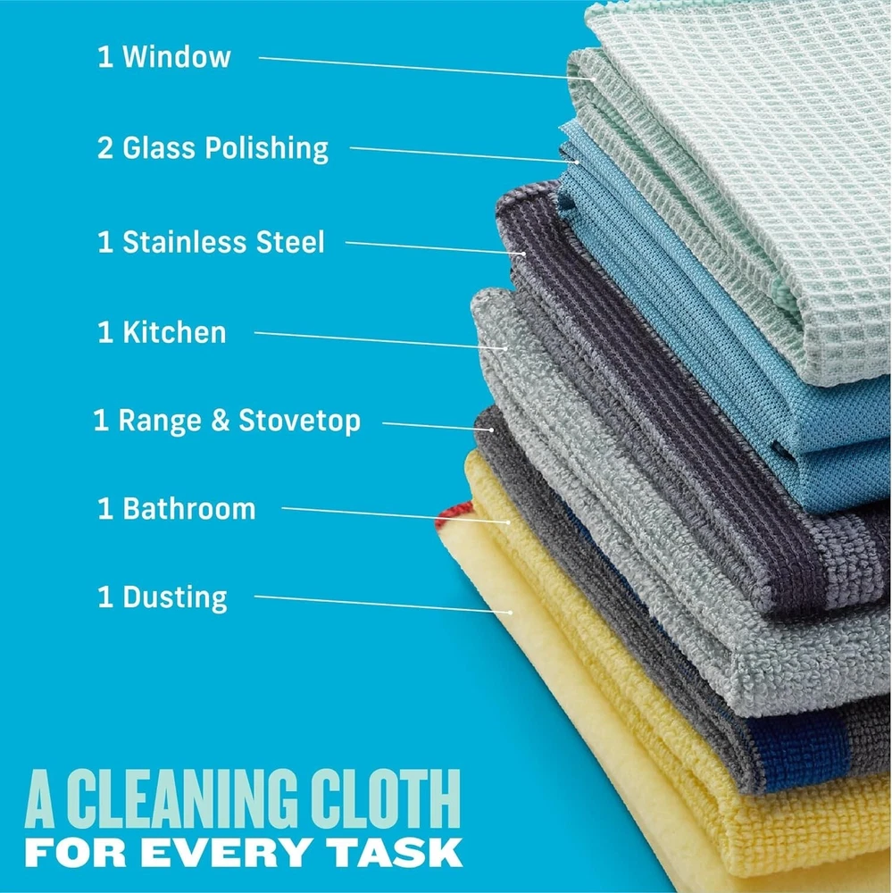 Home Cleaning Set, Premium Microfiber Cleaning Cloth, Household Cleaning Tools & Supplies for Dusting, Bathroom, Kitchen & Cars, Washable & Reusable, 100 Wash SATISFACTION GUARANTEE, 8 Piece Set Microfiber Effective — Instantly equip yourself with all you need for a sparkling home with the Home Cleaning Set. Seven specialized microfiber cleaning and polishing cloths master every mess — all with just water. Additional dusting cloth traps particles ordinary dusters simply push around Easy — One purchase covers every surface you need to clean — from countertop to stovetop, and windows to tile — and keeps more money in your pocket Environmental — Cleans with the power of masses of precision-engineered microfibers, plus water's molecular might. No need to add additional cleaners — or worry about residues that could harm people and pets Eco-savvy — With made-to-last quality backed by our 3- or 300-wash SATISFACTION GUARANTEE, you may never put paper towels or additional cleaners in your shopping cart again + Water Is Enough — Dampen with water. Leave only water behind. So much simpler, swifter, and savvier, it's hard not to share the news With one purchase, the Home Cleaning Set equips you to clean and shine every surface in your home, from countertop to stovetop and windows to tile. This 8-piece set includes 7 cloths that remove over 99% of bacteria – 5 for cleaning and 2 for polishing – plus 1 cloth for dusting. With the muscle of masses of microfibers plus water's molecular might, there’s no need to add additional cleaners — or worry about curious kiddos or pets. Just dampen with water and wipe. Gentler to the planet, this set is also easier on your wallet. you may never put paper towels or additional cleaners in your shopping cart again.