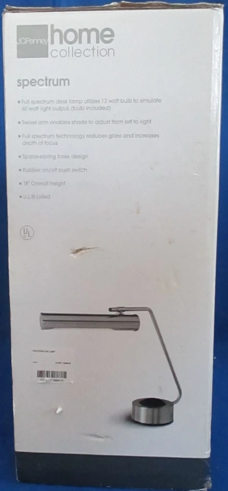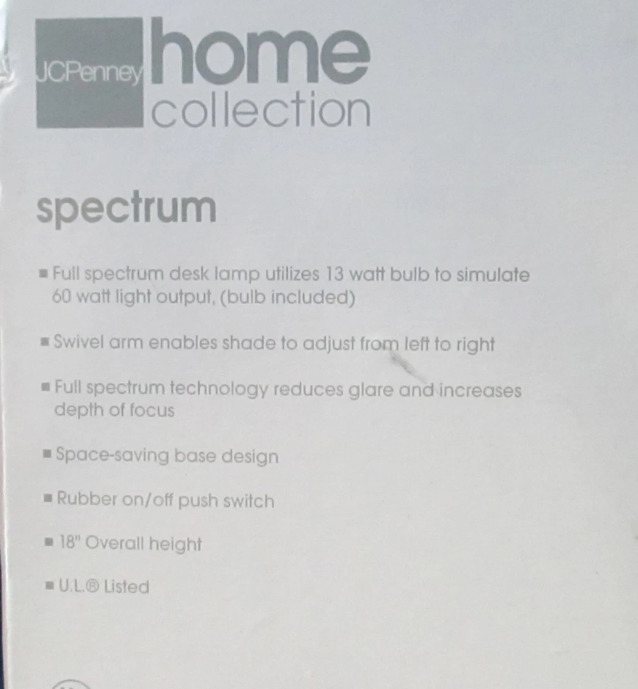 Full spectrum desk lamp utilizes 13 watt bulb to simulate 60 watt light output Swivel arm enables shade to adjust from left to right Full spectrum technology reduces glare and increases depth of focus Space-saving base design Rubber on/off push switch 18" Overall height U.L Listed