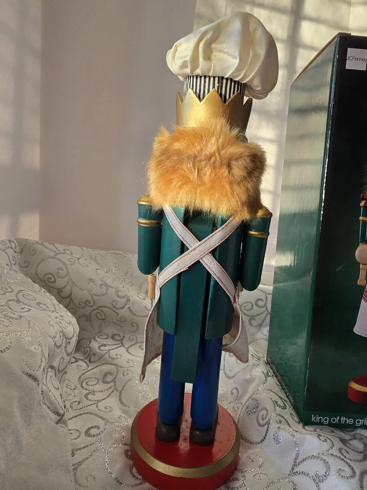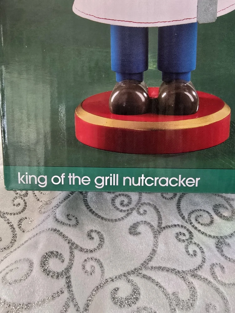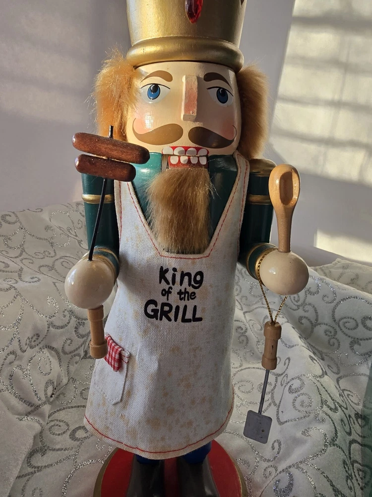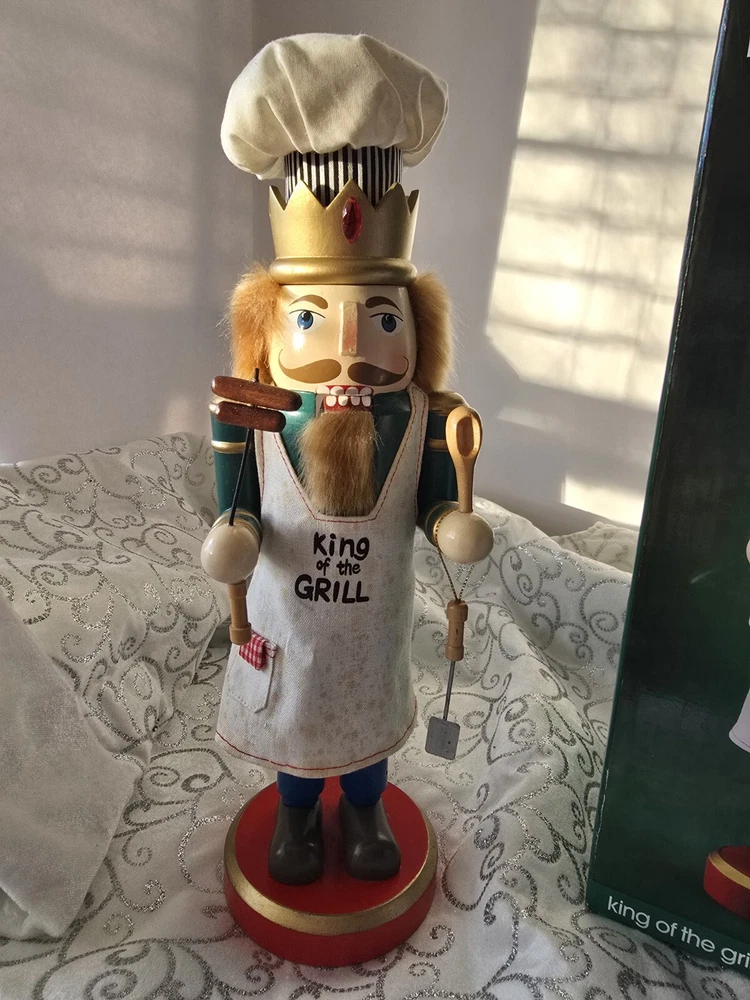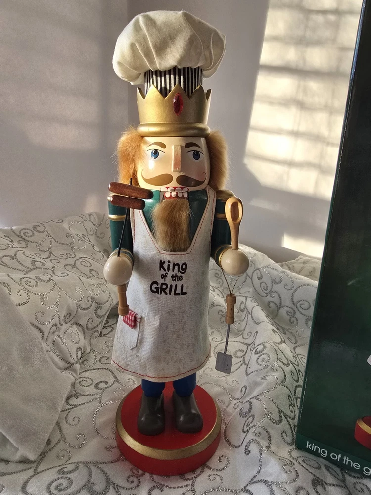 Bring the magic of Christmas to your home with this unique and beautifully crafted nutcracker. The King of the Grill design is perfect for any Christmas occasion and will add a touch of festive cheer to your décor. Made from high-quality wood, this nutcracker is durable and features an all-over multicolor pattern that is sure to catch the eye of anyone who sees it. The nutcracker comes with a hat and measures 15 inches in height and length, with a width of 5 inches. It is an original piece and not a licensed reproduction, making it a perfect addition to any collection. The nutcracker is designed for adult collectors and is suitable for family recipients. Add this decorative piece to your holiday-themed collection today!