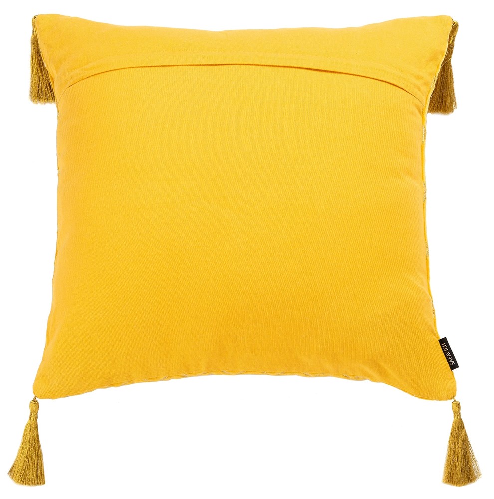 Bring a touch of bohemian beauty to your décor with this eye catching Cilan Pillow. Flaunting a textured Moroccan lattice over its luxuriously soft cotton velvet, Cilan brightens any space with its bold yellow hue and playful tassel details. [CHIC DESIGNER DETAILS]: Features luxuriously soft cotton velvet in a bold yellow hue with a textured lattice pattern and playful tassel details [FULL DIMENSIONS]: Square pillow measures 18" wide x 18" high [PERFECT FOR ANY ROOM]: Add decorative flair to the sofa, bed, club chair, bench or settee with this decorative pillow [INSERT INCLUDED]: Includes a soft polyfill insert for instant comfort and a back zipper closure for easy cleaning [TRUSTED BRAND]: has been a trusted brand and leader in home furnishings for over 100 years, using their specialty and expertise in crafting the trendiest and highest quality designs and selection of colors; Begin your rug, furniture, and home decor search with and explore over 100,000 products today
