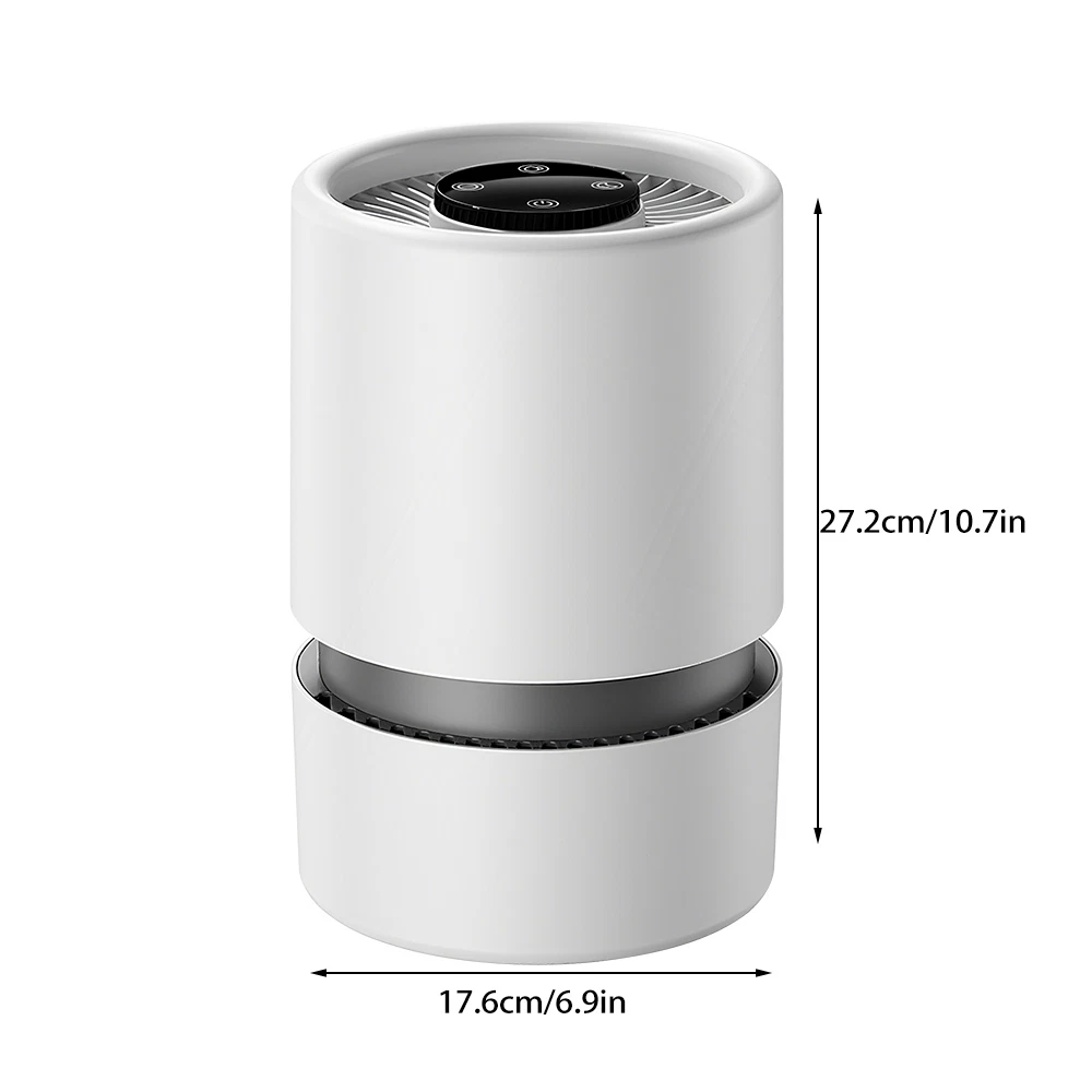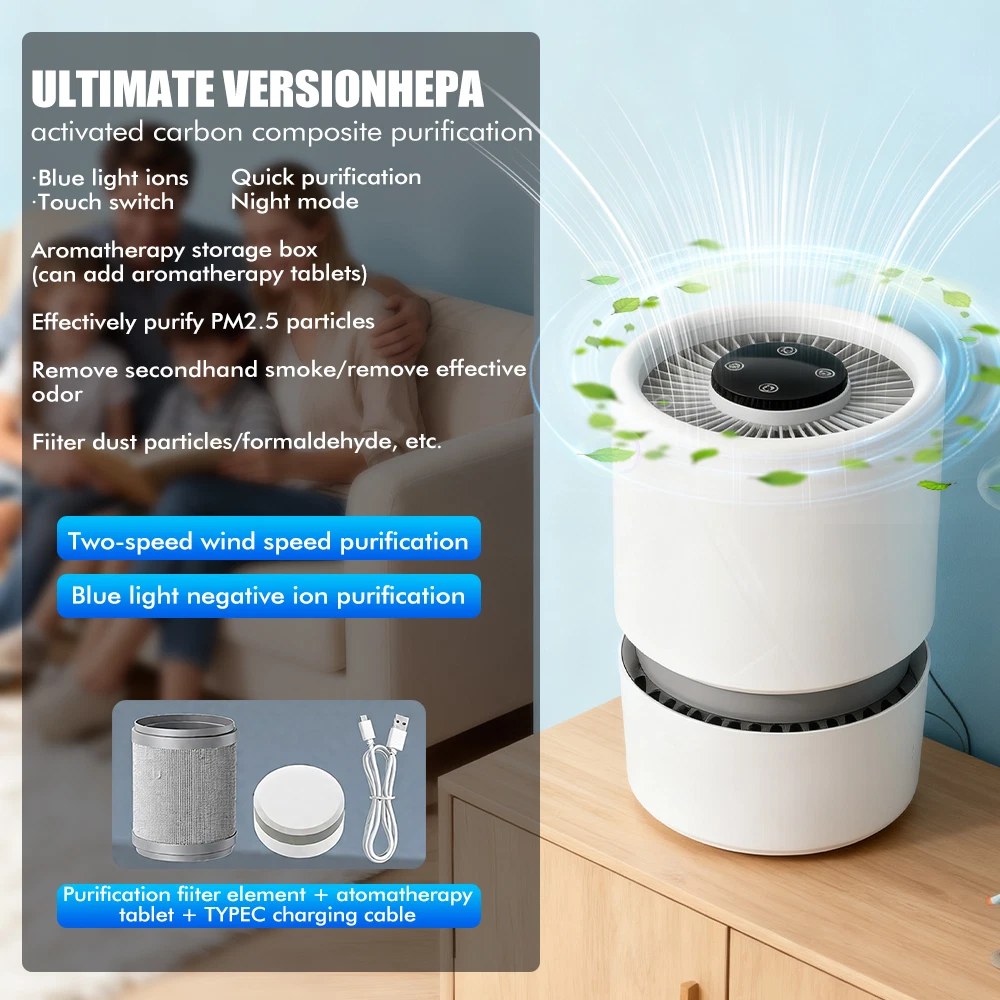 Pack age Lists : 1 * Air Purifier 1 * Filter Cartridge 1 * Charging Cable 1 * English Manual Feature s : Working principle: Activated carbon, HEPA technology Noise: above 70db (dB) Air purifier air volume: below 10 cubic meters per hour Power supply mode: USB Control mode: touch sensitive Applicable area: below 10 square meters Filter type: Composite filter Style: Desktop Style: Minimalist style Applicable scenarios: household use De scription : 1. It can filter out odors, improve air quality, and protect the health of you and your family. 2. Negative ions can purify the air, provide a good indoor environment, help people relax and improve their health. This portable air purifier suitable for cars and offices is equipped with a USB C cable, which can be powered by a car charging adapter and a computer. This air purifier offers two adjustable fan speeds to meet your specific needs. Ensure to create a peaceful environment that is perfect for sleeping or working. 5. Enjoy a quiet and peaceful bedroom and workplace environment. This air purifier is very quiet, you can run it all night and fall asleep peacefully.