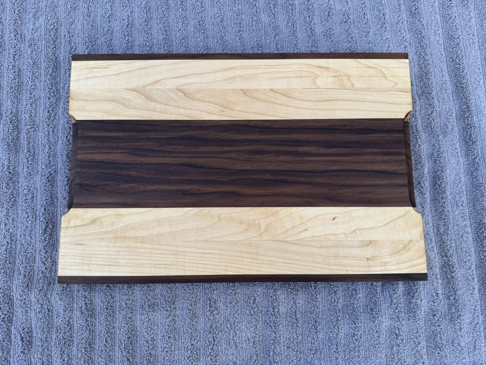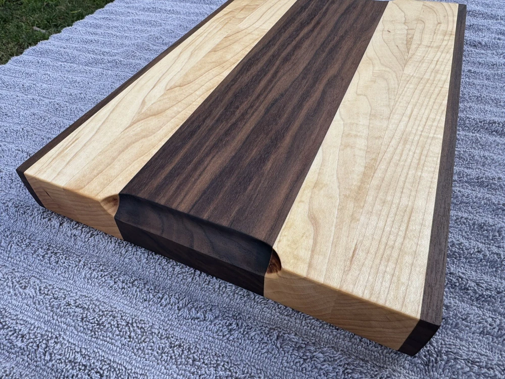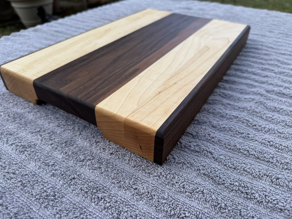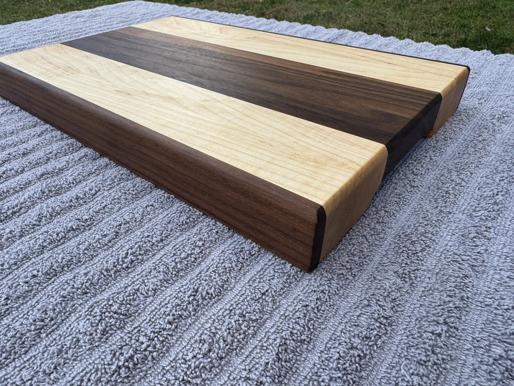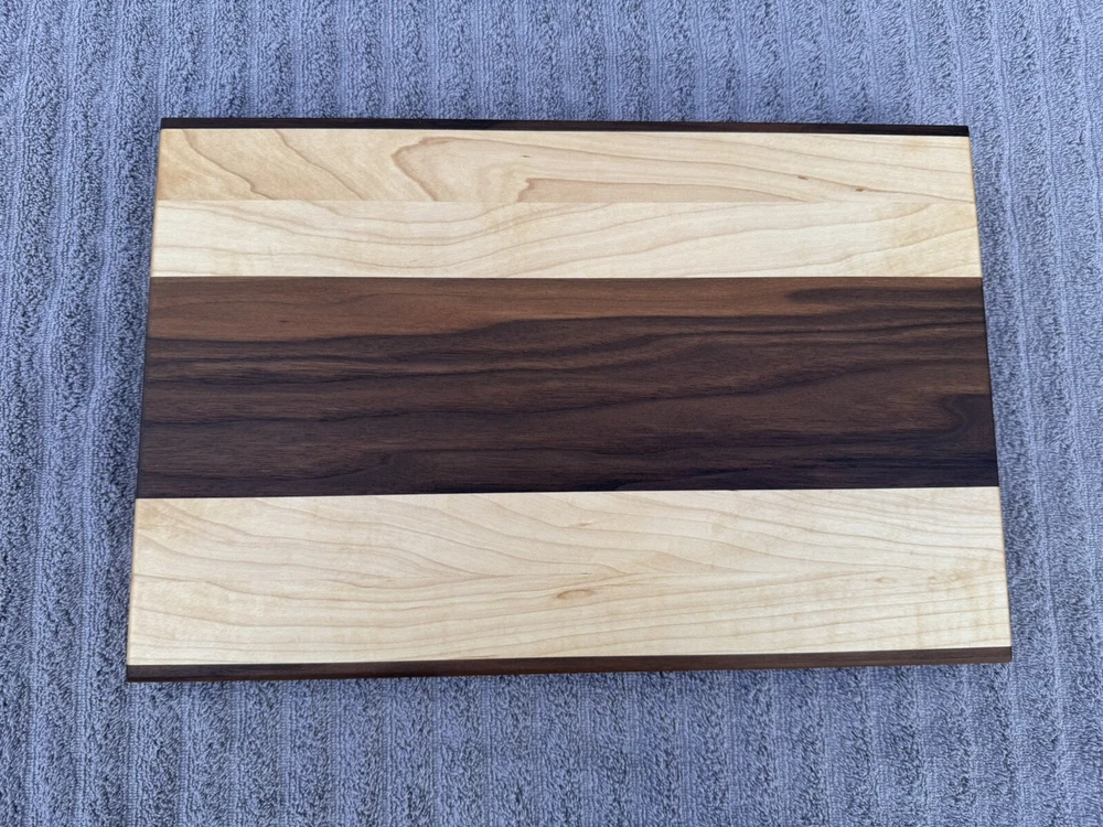 This cutting board showcases the natural beauty of two stunning hardwoods: rich, golden maple and dark, earthy black walnut. The smooth, polished surface reveals the intricate grain patterns of both woods, with the lighter tones of the maple contrasting beautifully against the deep walnut look. The seamless blend of these woods creates a striking visual appeal, while the board’s solid construction promises durability for years of use. Ideal for both food prep and as an elegant serving platter. -SIZE- L 15.5in W 10in H 1.5in All oil and wax used on the cutting boards are food safe and natural. -OIL USED- Bumblechutes woodworkers oil was used. -INGREDIENTS- Coconut Oil, Vitamin E Oil, Mineral Oil, and Lemon Oil. -CONTAINS- Tree Nuts (100% Pure, Fractionated Coconut Oil) -SHOP WAX- Bumblechutes shop wax was used on these cutting boards. -INGREDIENTS- Mineral Oil, Beeswax, Carnuba Wax, Vitamin E Oil, Lemon Oil.