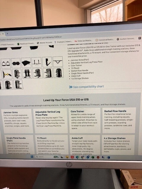 Take your home gym workout to the next level with the Force USA G10/G15 upgrade kit. This kit includes everything you need to improve your strength training routine and achieve better fitness results. The kit is designed for home use and is made from durable steel material, ensuring long-lasting use. The kit includes a variety of exercises equipment, such as squat rack, deadlift bar, and pull-up bar, all of which are perfect for gym and training activities. The black color of the equipment adds a sleek and professional touch to your home gym. This kit is perfect for anyone who wants to take their fitness routine to the next level. Brand new in unopened crate from a FORCE USA fitness equipment dealer in CT. Level up your Force USA G10 or G15 All-In-One Trainer with our exclusive G10 & G15 Upgrade Kit*. Adds three additional strength training stations, three functional attachments, a TV mount, and four convenient storage shelves for one irresistible price. Jammer Arms (Pair) Adjustable Vertical Leg Press Plate Core Trainer TV Mount Barbell Row Handle Single Metal Handle (Pair) Ankle Cuff 4 x Storage Shelves