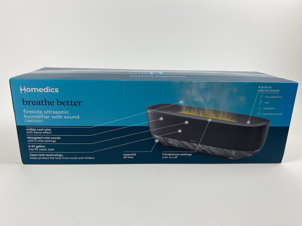 The Homedics Fireside Ultrasonic Humidifier with Sound CMF57GY is a tabletop humidifier that offers an ultrasonic method of humidification. It is designed by the brand HoMedics and operates with an electrical power source. The sleek black color and the unique sound feature make it a stylish and functional addition to any room, providing relief from dryness and discomfort. Ideal for personal or whole room use, this model is a convenient and efficient solution for maintaining optimal levels of humidity and Sound