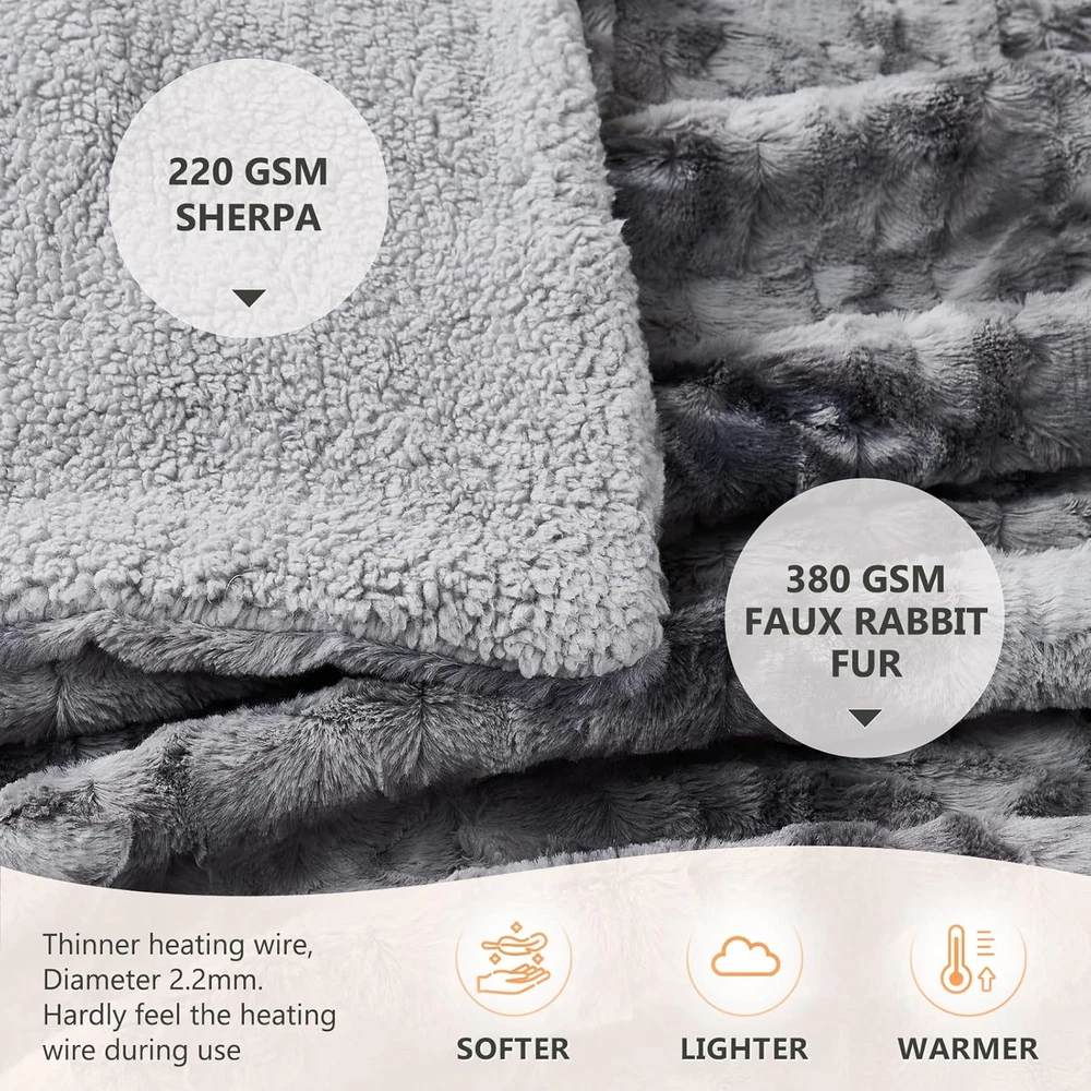 Product Dimensions: 50"L x 60"W Theme: Heated blanket Item Weight: 3.52 pounds Style: Contemporary Number of Items: 1 Special Feature: Flame Resistant Refill: 380gsm Faux rabbit Fur + 220gsm Sherpa Fabric Type: Sherpa、faux Fur UPC: 744110499575 Type: Does not apply Included Components: Controller, Power cord Water Resistance Level: Not Water Resistant Model Name: YZH-5060T Product Care Instructions: Machine Wash Unit Count: 1.0 Count Pattern: Solid Fill Material: 380gsm Faux rabbit Fur + 220gsm Sherpa Age Range (Description): Adult Seasons: Winter Recommended Uses For Product: Napping gtin13: 744110499575 Material: 200gsm Flannel + 200gsm Sherpa Blanket Form: Throw Blanket Brand: Homemate Item model number: YZH-5060T Fabric Warmth Description: Heavyweight Batteries required: No Sport: Camping Color: Grey Manufacturer: Homemate Size: Does not apply