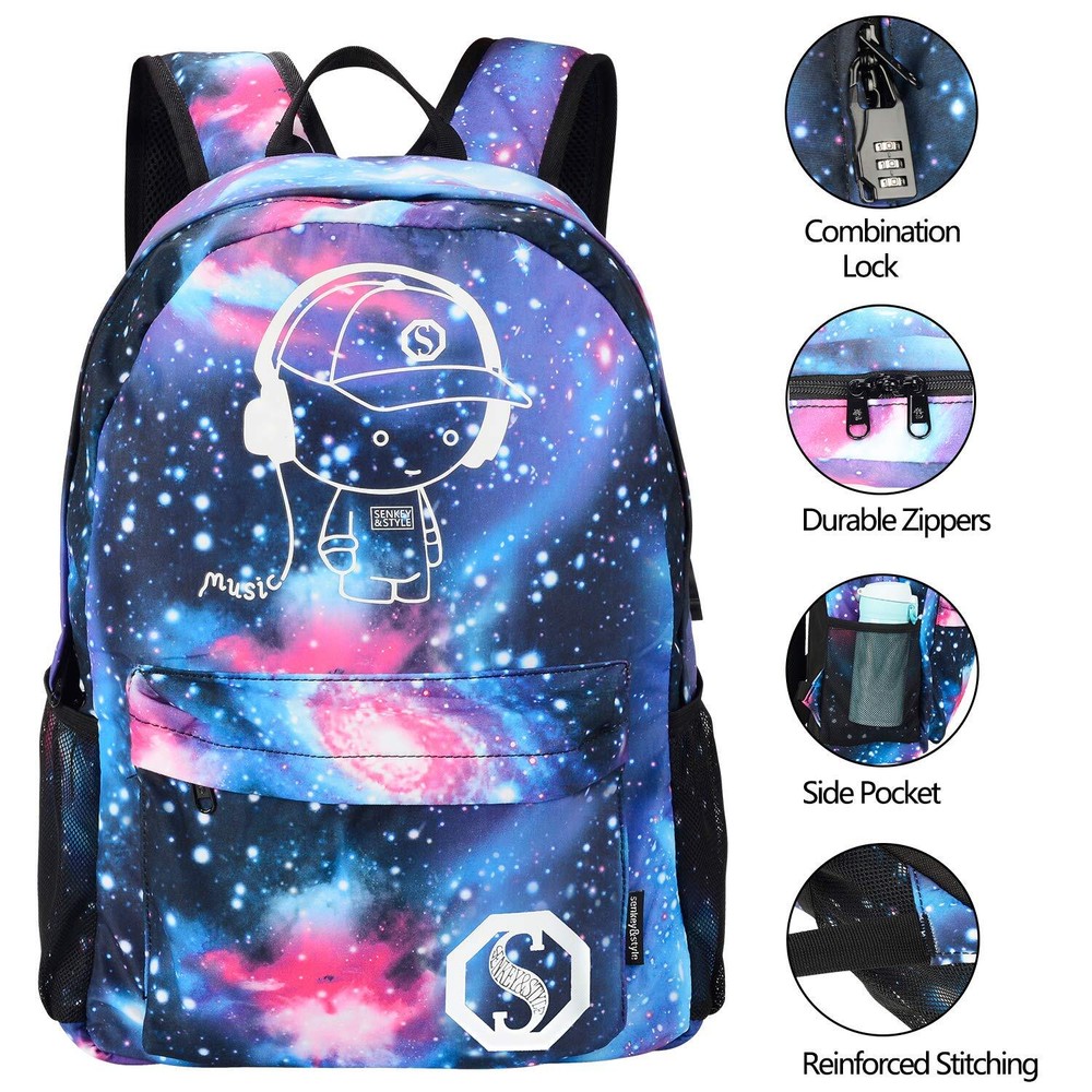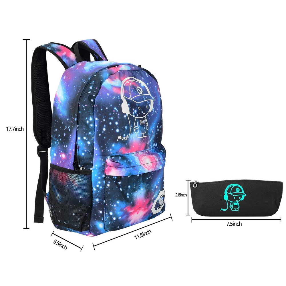Features: External Charging: An external USB port provides a more convenient and easier way to charge your phone. Please noted that power bank is not included. The cool backpack has padded adjustable straps and padded back that make it comfortable to carry. Large capacity: Backpack size is 18.9*11.4*6.7 Inches; You can put laptop, books, magazines, power bank, clothes, iPad, pencil, keys, coins, cards,wallet,earphones,water bottle, cups, umbrella,etc. This school bag is made of waterproof Oxford Textile and heavy-duty inner lining, you can take it in a rainy day! The materials is durable and easy to clean, machine washable, anti-scratch for extra security and long-lasting protection. Free Combination lock work with durable metal zippers close and open smoothly to keep your stuff inside the backpack safe while commuting. Free Pencil Case: The pencil bag is big enough for pencils, keys and other small school essentials. Suitable for a variety of Situations: Suitable for all school bookbag, book bags, student backpack, collage backpack, high school backpack, middle school backpack and suitable for teen boys backpack, teen girls backpack, kids backpack, hiking backpack, camping backpack, climbing backpack, traveling backpack, cycling backpack casual backpack, usb backpack, water resistant backpack, laptop backpack or outdoor activities backpack Washing Instructions: DO NOT washing with hot water. Washing separately to avoid staining. Washing with clean water with ordinary temperatures. Package Included: 1x Backpack 1x Pencil Bag 1x Password Lock 1x USB Cable FASHION LUMINOUS BACKPACK: The best part of this stylish cool backpack is after absorbing light in the day about 10-20 minutes, you can see the fluorescent effect in the dark and can keep about 4-6 hours. Makes you safer when jogging, walking and cycling at night. ANTI THEFT BACKPACK: Theft proof combination lock and dual-access zipper to keep your belongings safe, say goodbye to those pickpocket behind you. Purchasing this anime backpack, you will get 1pcs password lock +1pcs luminous pencil case + 1pcs USB cable by free. USB PORT DESIGN: With built in USB charger outside and built in charging cable inside, this school backpack with usb charging port offers you a more convenient way to charge your phone while walking. Please noted that this backpack doesn't power itself, usb charging port only offers an easy access to charge. LARGE CAPACITY & LIGHTWEIGHT: 18.9*11.4*6.7 Inches, fits laptop up to 15.4". Multiple divider pockets to hold laptop,cellphone, iPad, power bank, pen, keys, wallet, books, snacks, clothes, umbrella, water bottles, and more.This water resistant backpack is made of durable eco-friendly Oxford fabric with good breathability, ergonomic design of shoulder strap and scientific reasonable weight-bearing design. Luminous bookbag is suitable for kids, girls and boys back to school, travel, hiking, camping, cycling, shopping, dating, birthdays, Christmas day and etc. Recommended Age Grading: Over 6 years old.