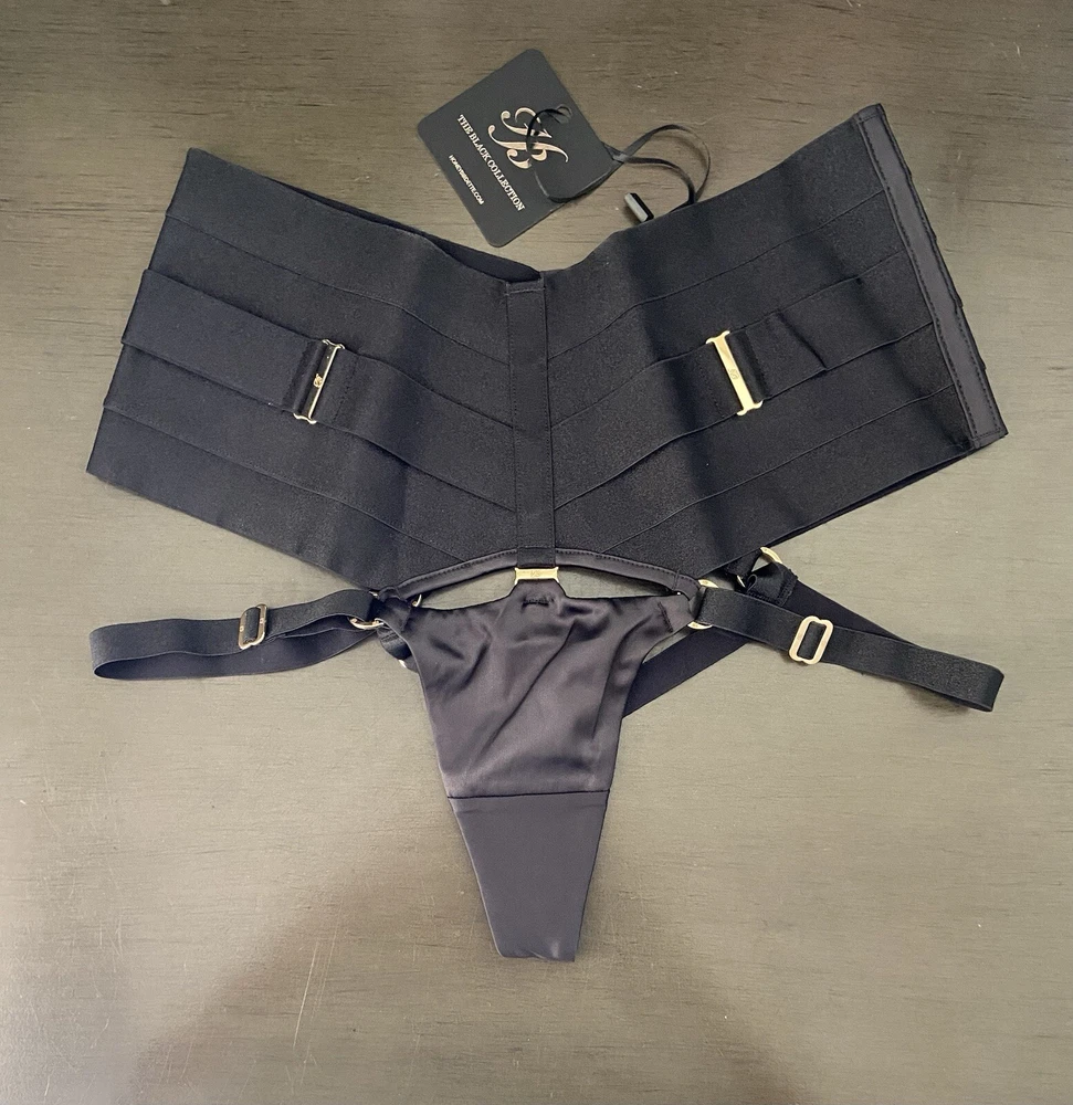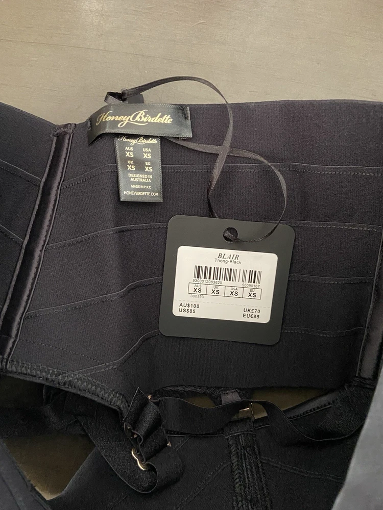 Honey Birdette Blair Black Thong Panty, Size XS, New With Tags. Say hello to the ultimate contour collection… Blair is the sleek black lingerie that puts shapewear to shame. Our hidden secret? Each piece is made with high-compression elastics of European design. Made both stylish and functional, Blair is tailored to sculpt the body and put a little swing in your step. High-waisted thong Sexy shapewear underwear Wide top band with tummy control Made with high-compression elastics Stretchy sides with adjustable slides Keyhole at the back in an open V Cotton lined gusset